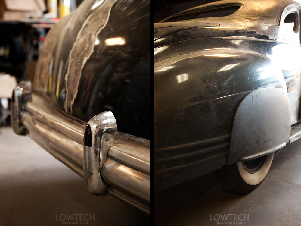 Another great and very traditional custom touch: the bumper guard tail lights. Mark Garza made the tail light lenses. The fender skirts are mocked up and we're looking forward to the decision on their final design.