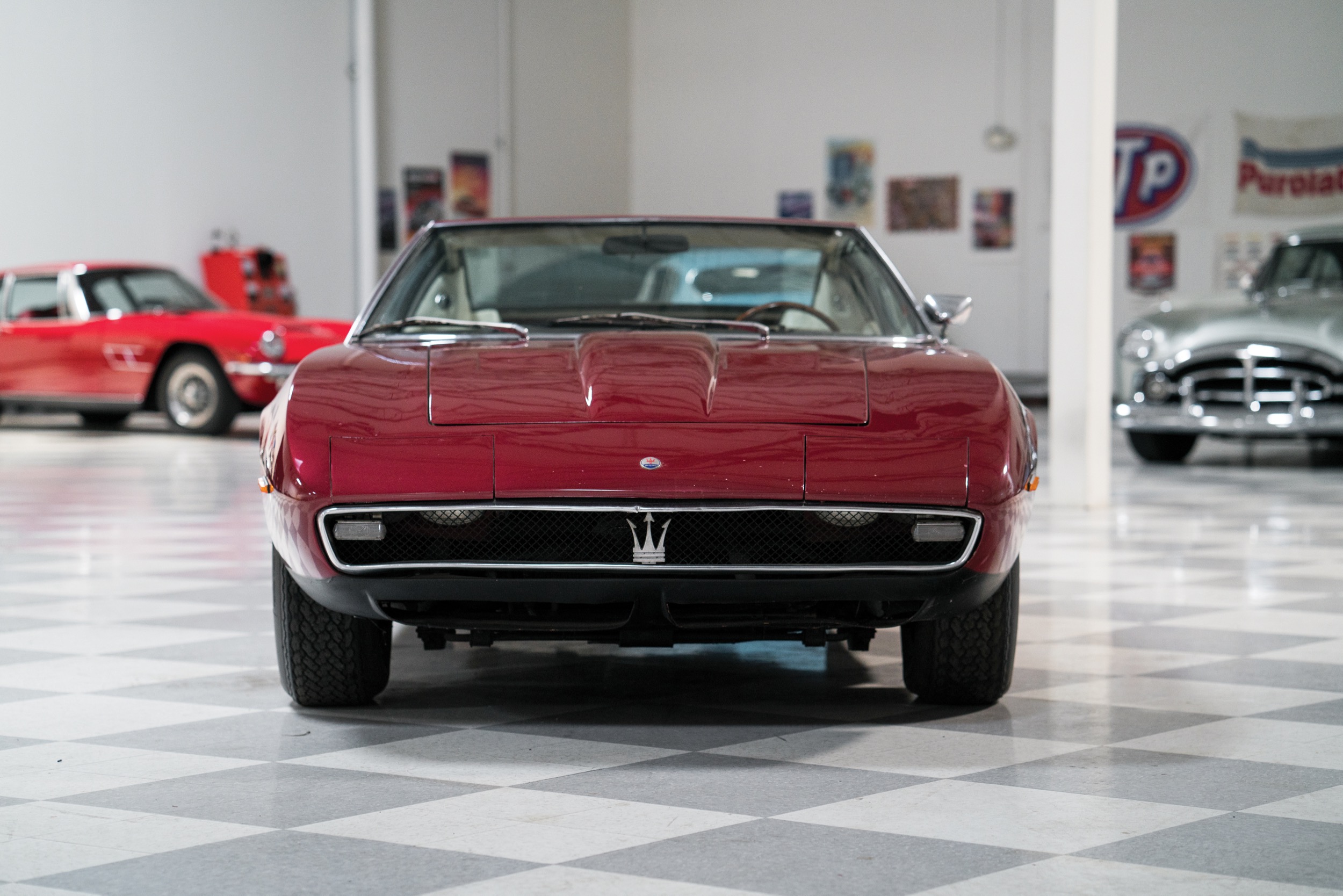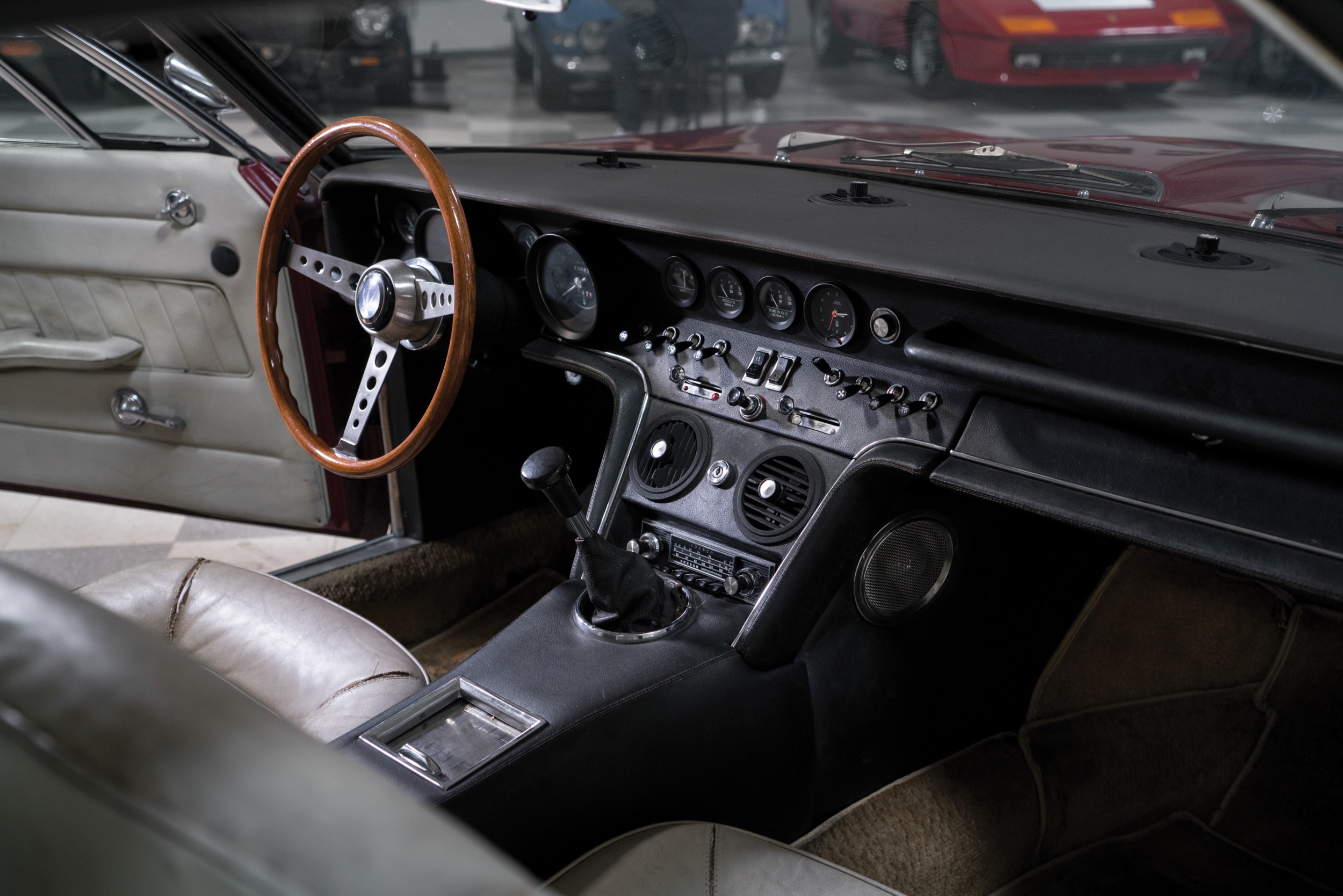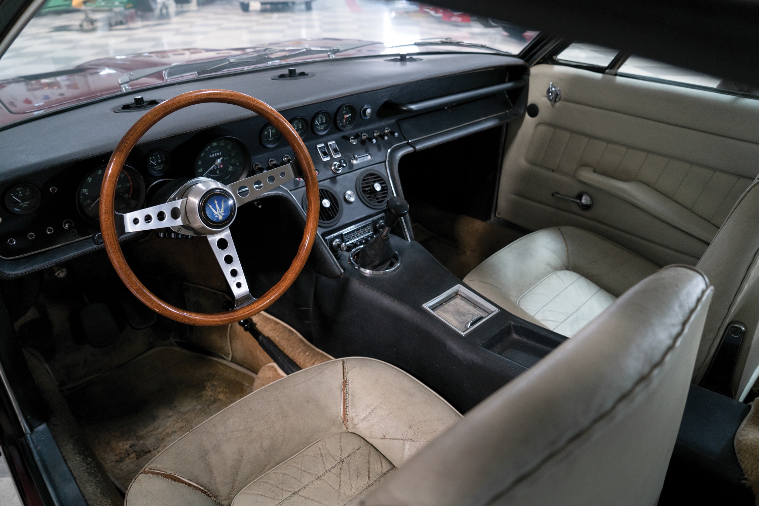 In jenen wilden Jahren 1988/89, als die Spekulanten die Oldtimer entdeckten, schossen die Preise für Ghiblis auch einmal über die Millionengrenze. Danach stürzten sie gnadenlos ab, dümpelten, zumindest in Europa, lange in einem ganz knapp sechsstelligen Bereich, unterdessen sind es so ab 120’000 Euro; für die Spyder wird natürlich mehr bezahlt, so etwa eine Viertelmillion Franken, doch viele Spyder sind gar keine, sondern Umbauten. Immerhin: die Ghibli gelten als zuverlässig, auch die Lage an der Ersatzteilfront ist (pekuniär) nicht so ernst wie bei Ferrari und Lamborghini. Es kommt gerade wieder mal ein schöner Ghibli, ein 68er in Dunkelrot, unter den Hammer, er wird von RM Sotheby’s auf ab 160’000 Dollar geschätzt – wir zeigten ihn schon oben im Detail.