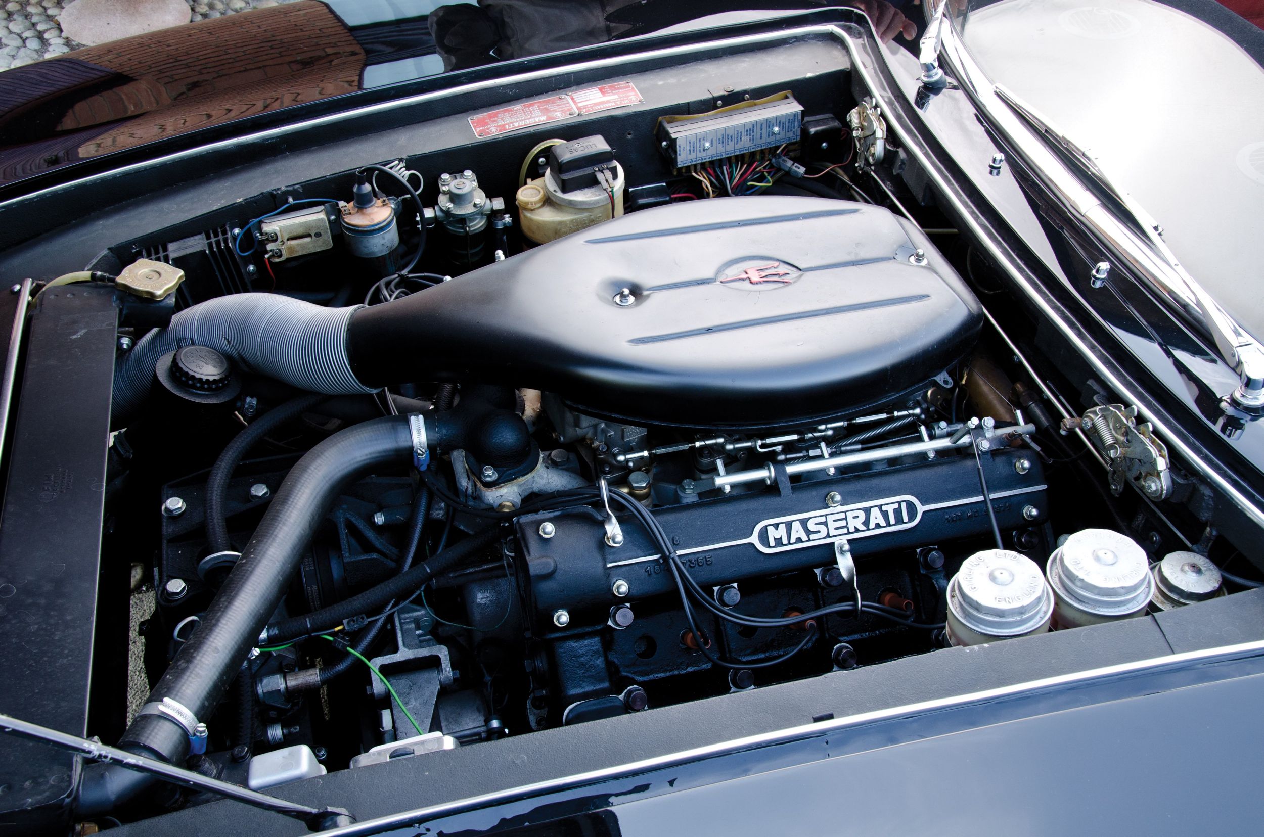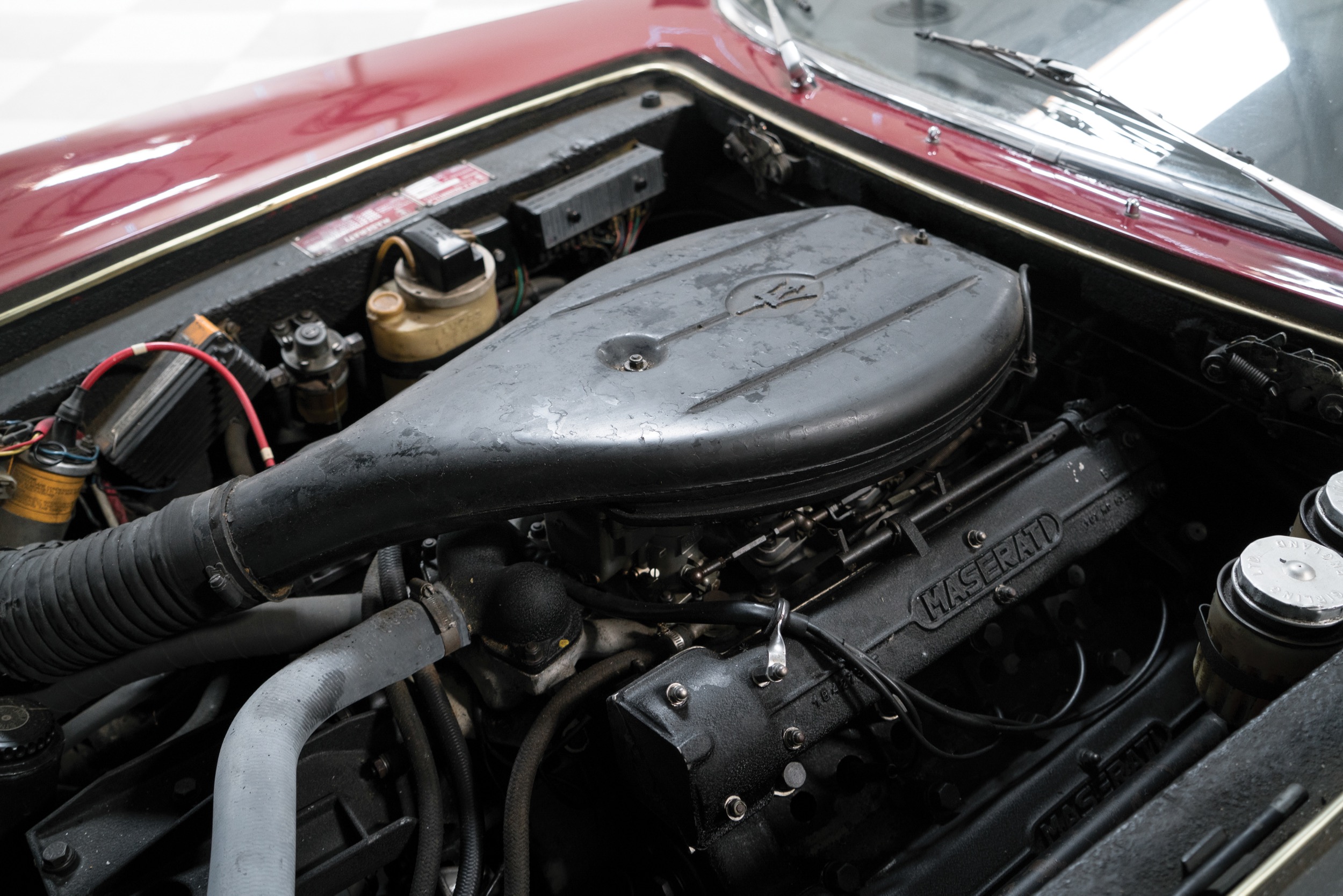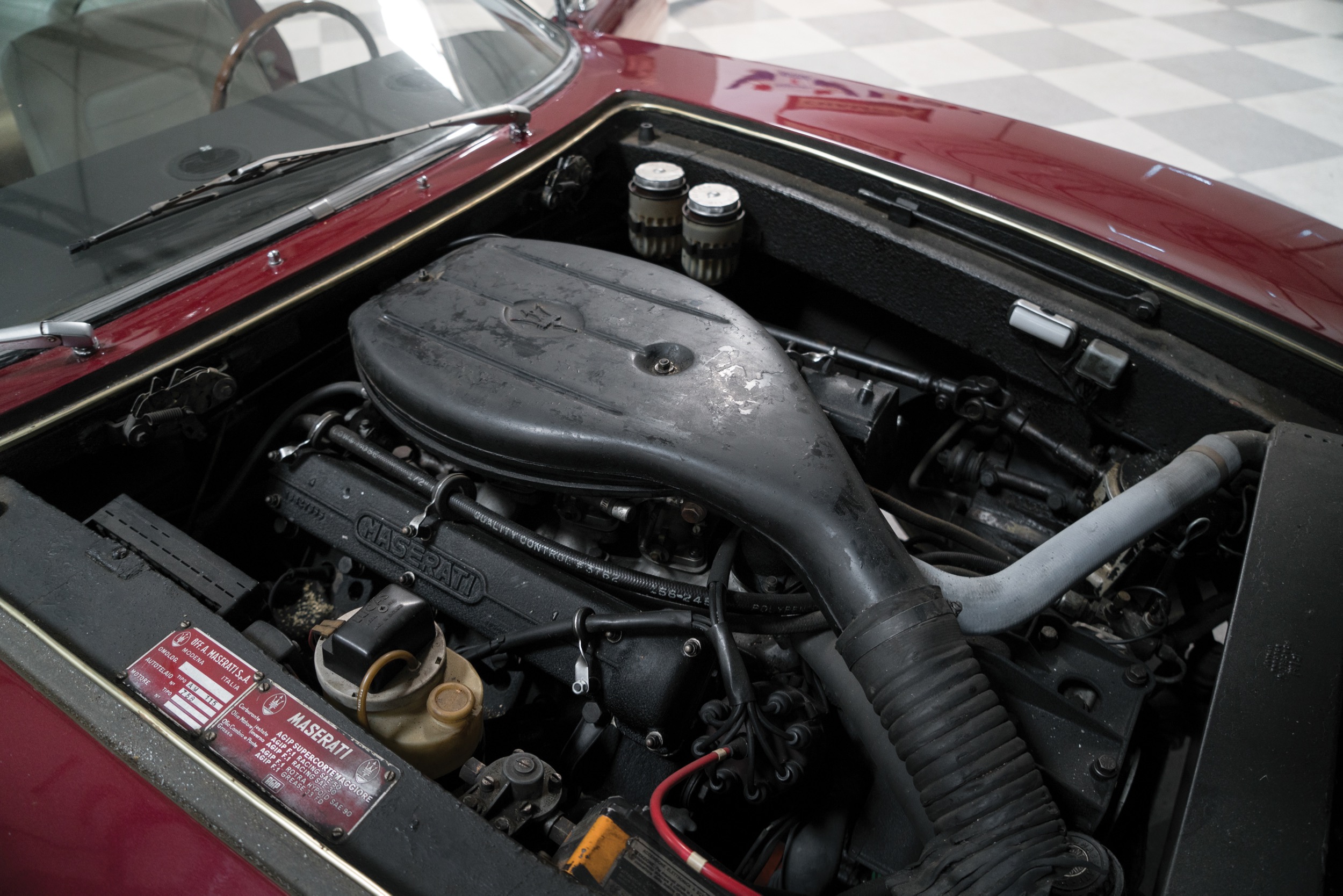 In der ersten Version wurden zwischen 310 und 330 PS gemessen, ab 1970 gab es dann den SS 5000, der 4,9 Liter Hubraum hatte und sichere 335 PS, dies jeweils bei 5500/min. Gutes Drehmoment, 440 Nm bei 4000/min beim 4700er, 480 Nm dann beim SS 5000. Der Sound eines Ghibli gehört auch heute noch zur feinsten Musik der Autowelt, irgendwo zwischen dem amerikanischen V8-Brummeln und dem typisch italienischen Kreischen. Und: das Aggregat des Ghibli sollte sich als deutlich langlebiger als die V12 der Konkurrenz erweisen, es waren auch längere Autobahnfahrten bei hohen Geschwindigkeiten möglich. Geschaltet wurde über ein 5-Gang-Getriebe von ZF (das seine Karriere in einem Hanomag begonnen hatte – und einen hohen Kraftaufwand benötigte); ab 1968 gab es auf Wunsch auch eine Dreigang-Automatik von Borg Warner.