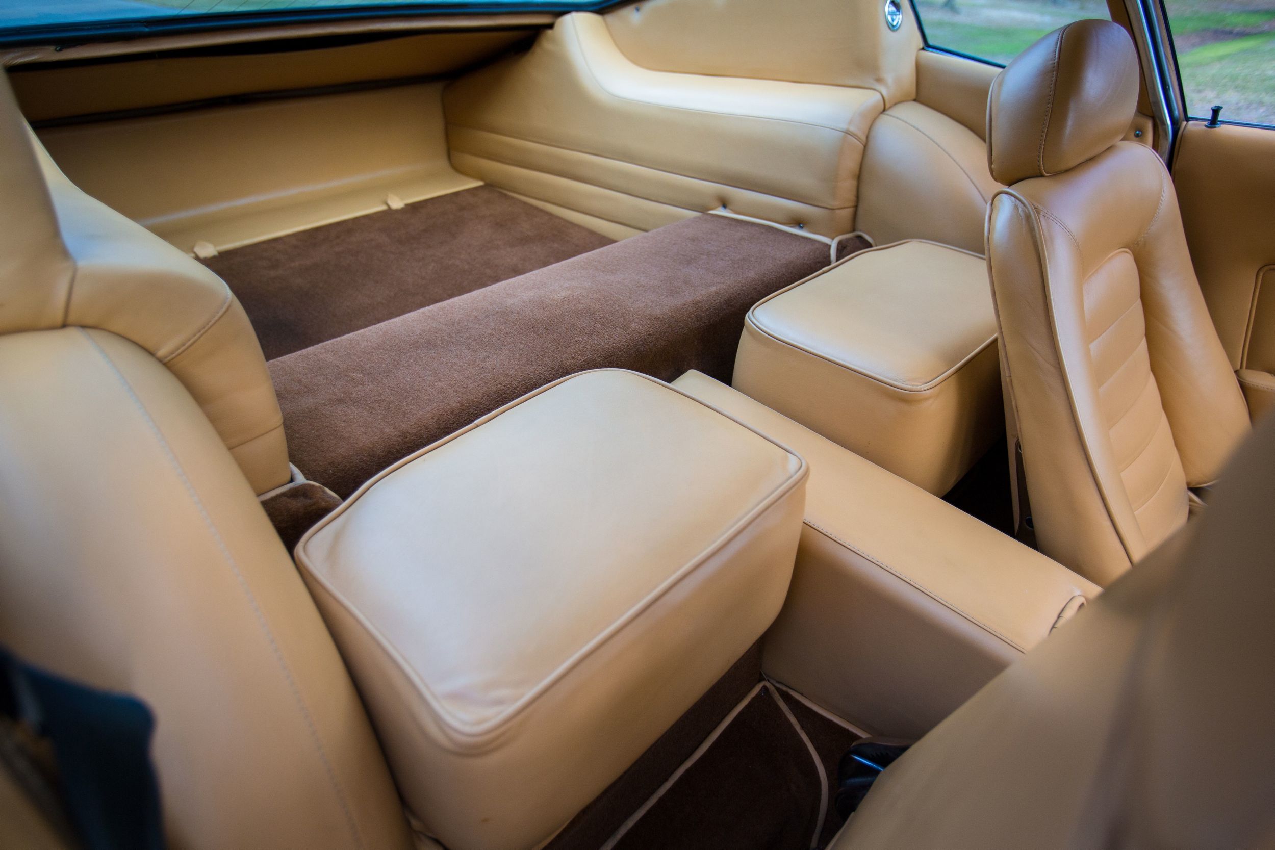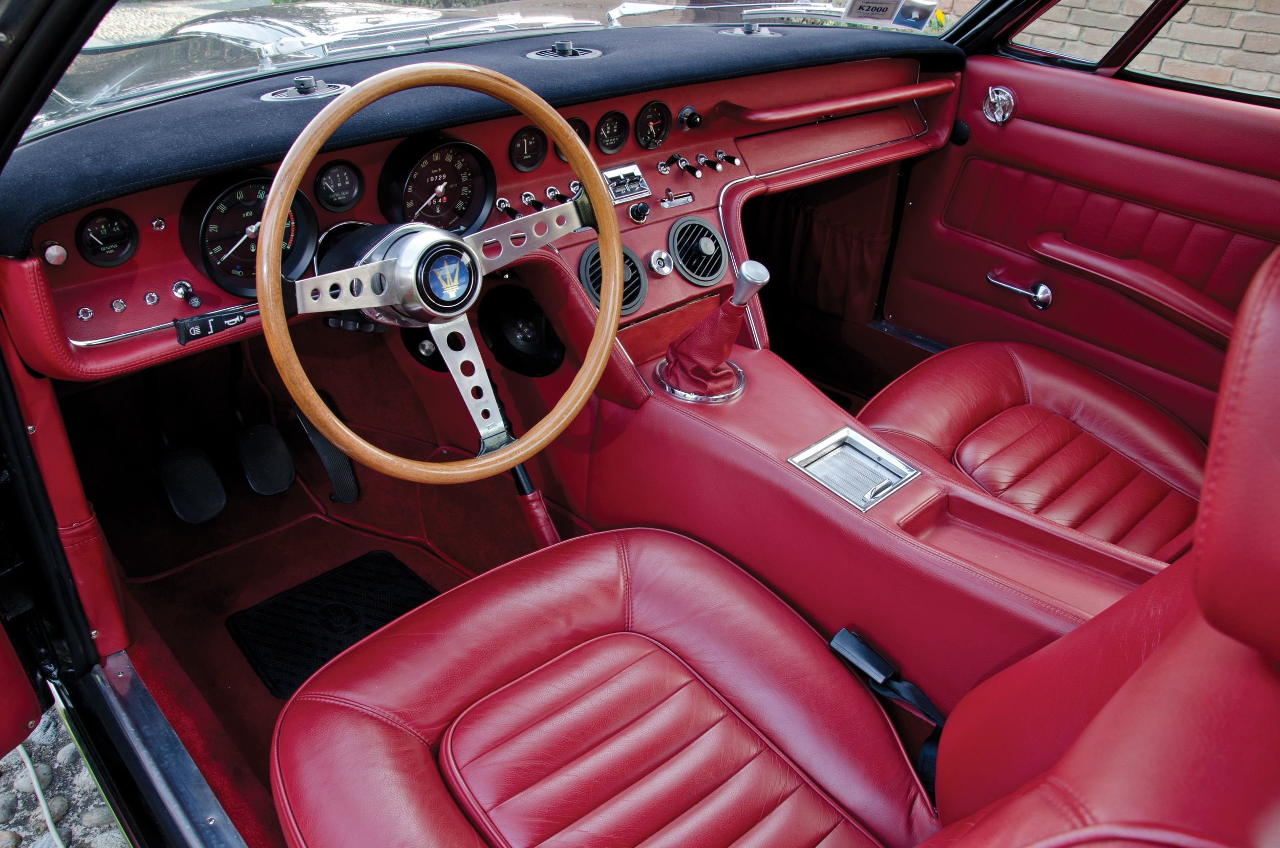 Innen – naja. Es ist eher schlicht, sehr flächig. Ja, schöne, sehr klassische Uhren, aber für die Anbringung ebendieser erhalten die Innenraumgestalter jetzt keinen Preis. Ein mächtiger Mitteltunnel. Die Sitze halt so, wie die Sitze damals waren, Seitenhalt schien noch kein Thema gewesen zu sein. Aber weil das Fahrzeug schmal ist und der Mitteltunnel breit, rutscht man dann trotzdem nicht weit. Und man kann sich ja auch am schönen Holzlenkrad festhalten. Ganz hinten ist viel, viel Platz, anscheinend dachte man in Modena schon damals an die zukünftigen Golfbag-Transportierer.