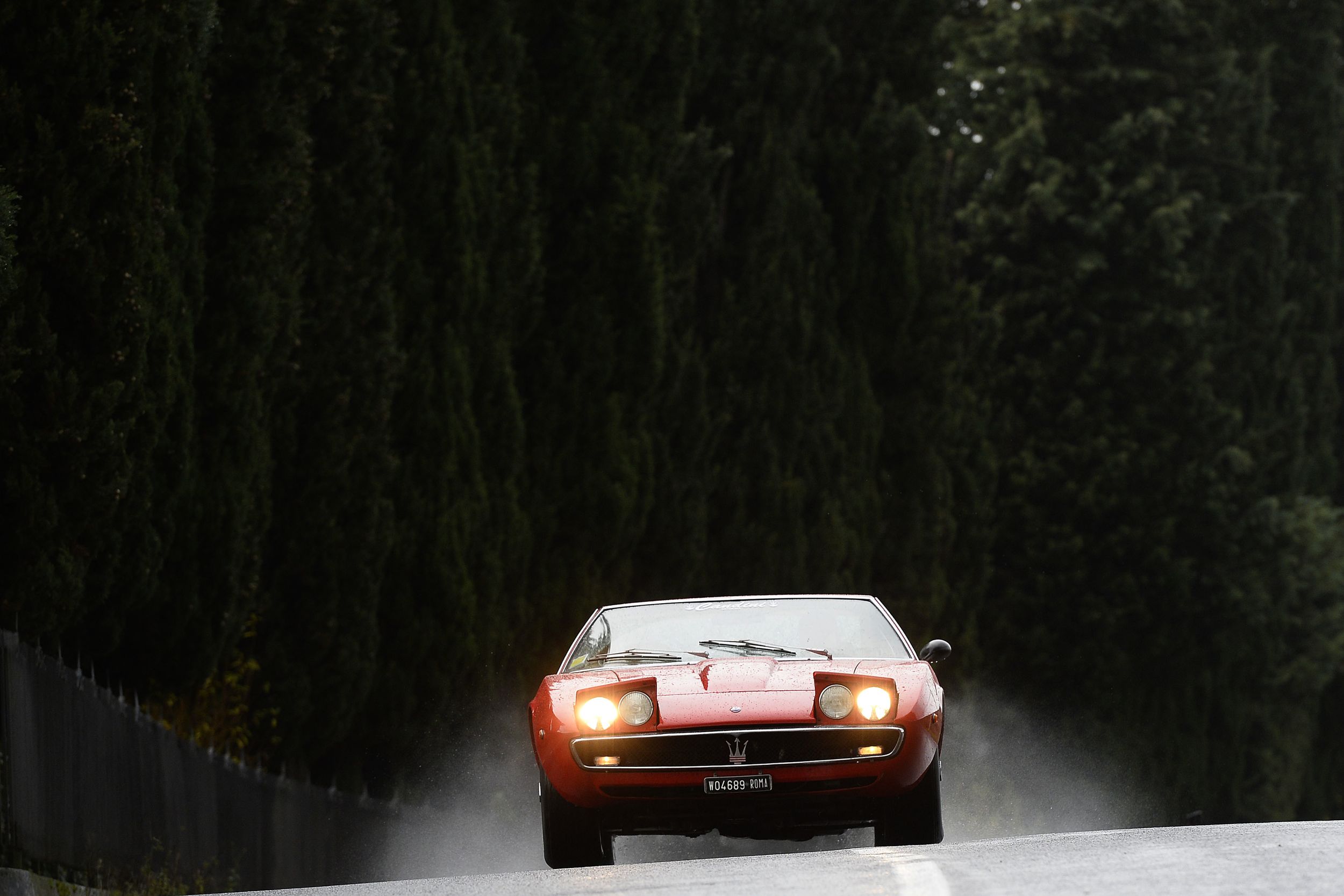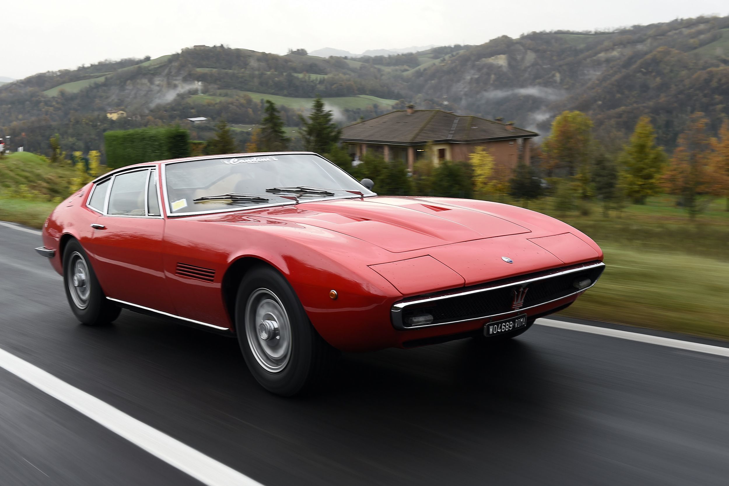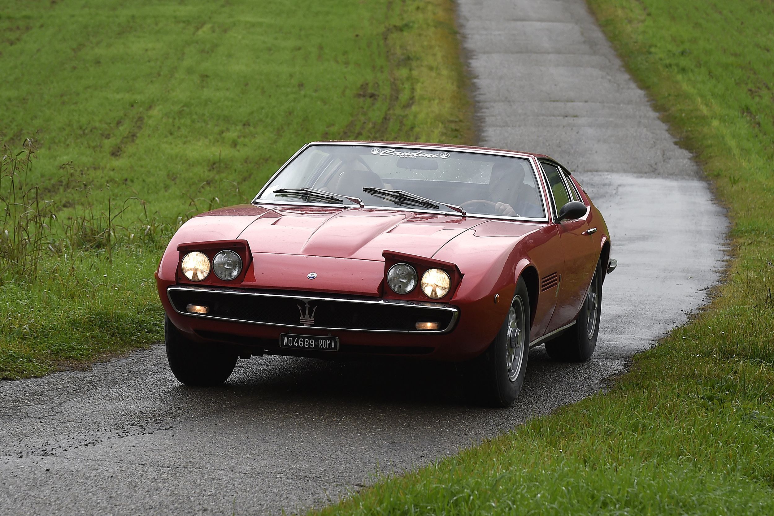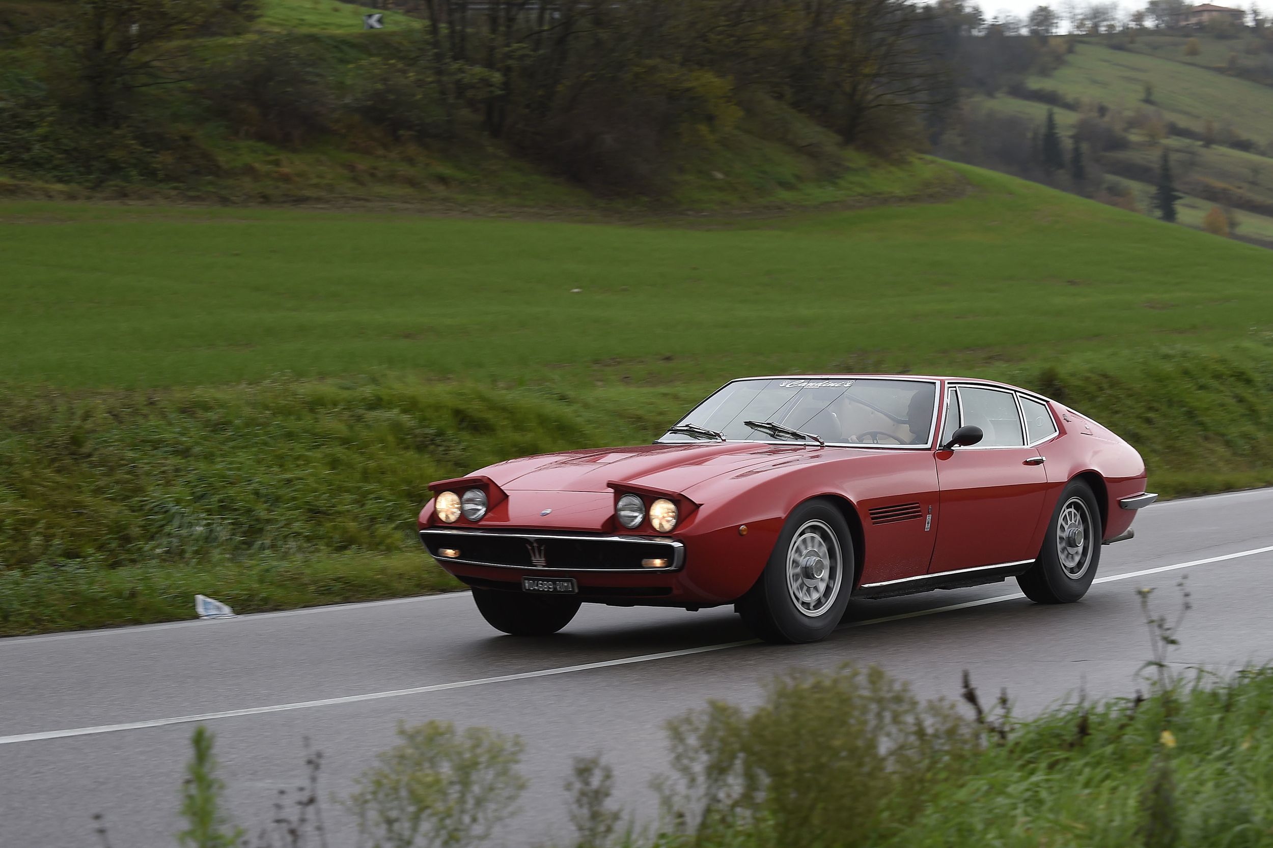 Man könnte ja meinen, so ein Ghibli mit dieser ausgeprägten Keilform sei unübersichtlich. Ist er aber nicht. Auch deshalb, weil er halt keine 2 Meter breit ist wie moderne Sportwagen. So brausen wir schon ganz flott aus Bologna raus, in Richtung Berge im Süden, die Strasse ist nass, der Regen rauscht, kalt ist es auch. Aber auf der Autobahn ist er ganz fein, ein dumpfes Grollen aus dem Motorraum, bisschen mehr als 3000/min im 5. Gang bei Tacho 150+, und es ist ein angenehmes Reisetempo, man kann sich auch noch gut unterhalten. Die Bremsen lassen sich deutlich besser dosieren als im 3500 GT, sie zeigen sogar etwas Wirkung – er lässt sich bewegen wie ein einigermassen modernes Auto. Dann geht es in die Berge. Nebel und alles, was man auch sonst im Leben nicht braucht. Und dort merkt man ihm die Jahre dann schon an, dem Ghibli. Und auch, dass er auch für damals keine besonders moderne Konstruktion war. Das liegt an der Starrachse hinten. Es ist schon erstaunlich, dass Maserati sich für diese Lösung entschieden hatte (und das Ding nicht einmal selber bastelte, sondern bei der Salisbury Wheel Company zukaufte), denn der damals schon gut ausgereifte Quattroporte hatte eine anständige De-Dion-Hinterachse (ok, das ist auch eine Starrachse, aber halt: besser).