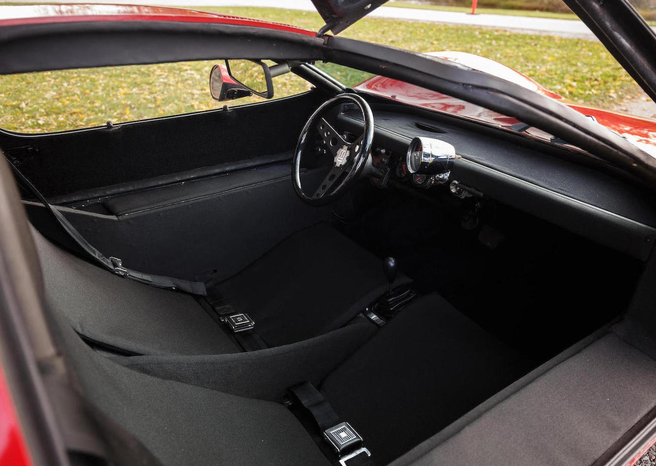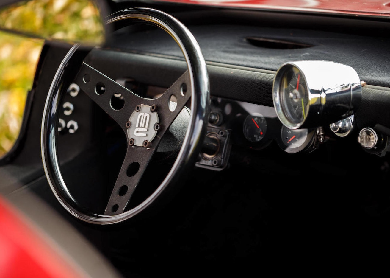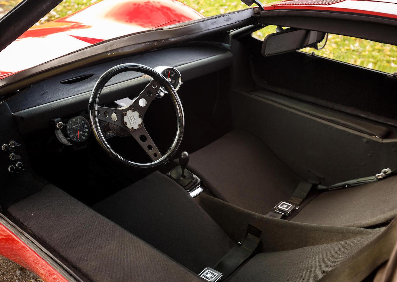 Man braucht sich nicht zu schämen, wenn man den Molzon bisher nicht kannte. Es gibt nämlich nur gerade diesen einen. Und dieser eine ist anscheinend seit den 70er Jahren auch nicht mehr bewegt worden, weniger als 1000 Meilen stehen auf seinem Tacho. Und sollte man ihn, damals, auf der Strasse übersehen haben, so ist das auch nicht weiter verwunderlich, der Floh ist nur gerade 3,45 Meter lang, 96 Zentimeter hoch und 1,57 Meter breit – wohl deshalb wirken die 13-Zöller vorne und 14-Zöller hinten sanft überdimensioniert. Das Gewicht des Molzon Concept Corsa GT38 mit seinem Rohrrahmen und Glasfaser-Aufbau: 545 Kilo.