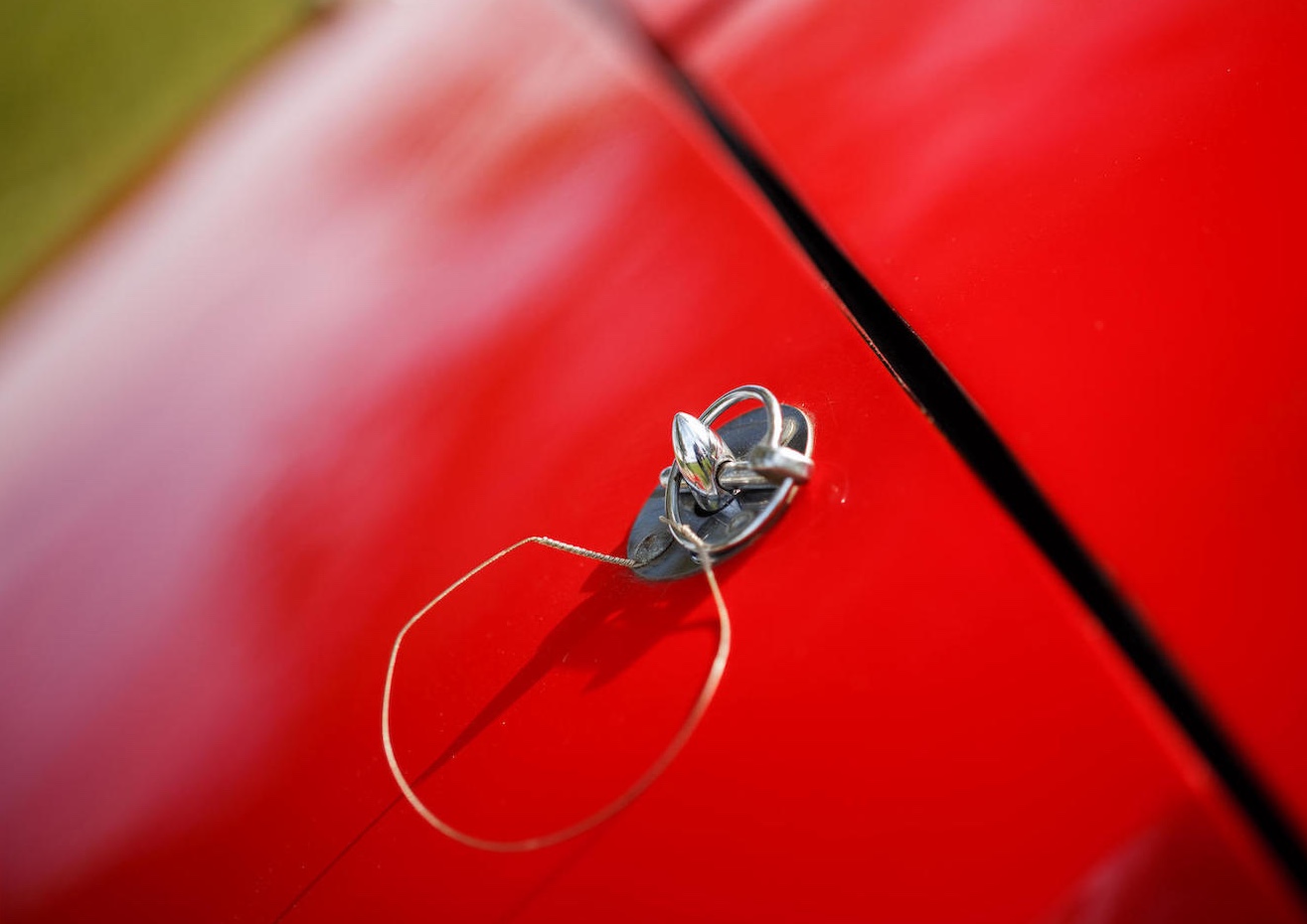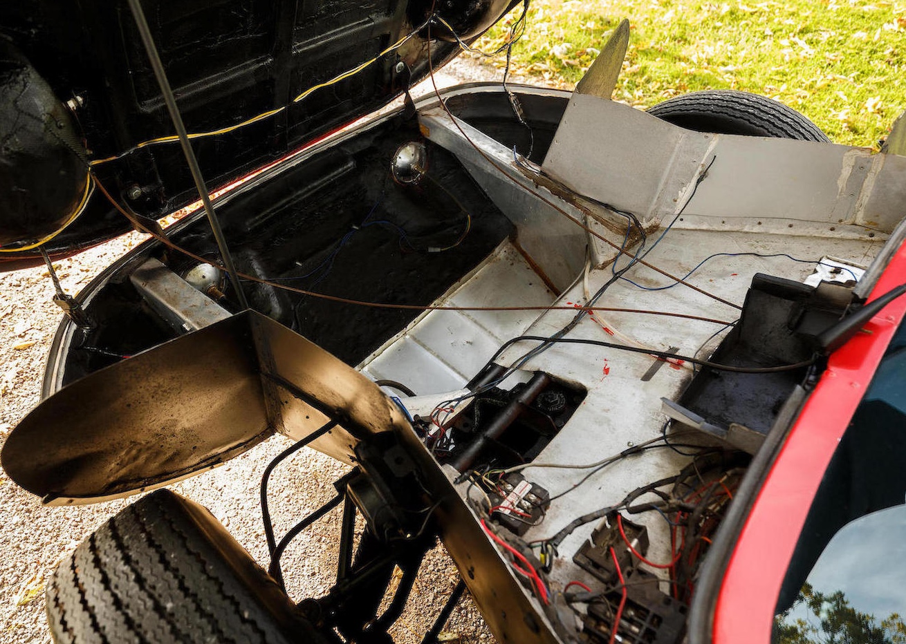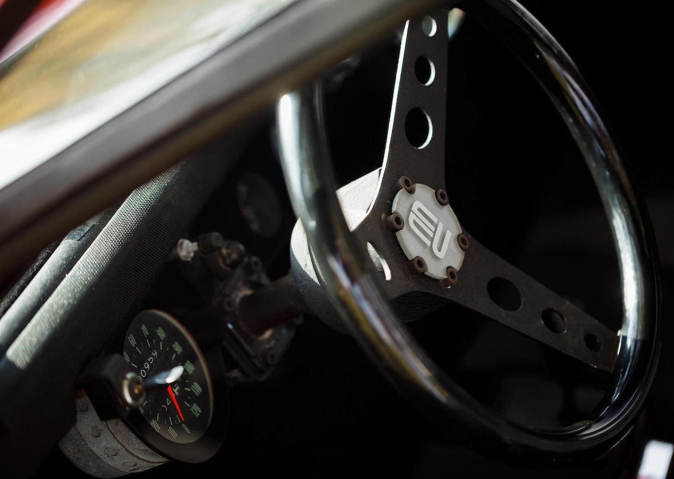 Man braucht sich nicht zu schämen, wenn man den Molzon bisher nicht kannte. Es gibt nämlich nur gerade diesen einen. Und dieser eine ist anscheinend seit den 70er Jahren auch nicht mehr bewegt worden, weniger als 1000 Meilen stehen auf seinem Tacho. Und sollte man ihn, damals, auf der Strasse übersehen haben, so ist das auch nicht weiter verwunderlich, der Floh ist nur gerade 3,45 Meter lang, 96 Zentimeter hoch und 1,57 Meter breit – wohl deshalb wirken die 13-Zöller vorne und 14-Zöller hinten sanft überdimensioniert. Das Gewicht des Molzon Concept Corsa GT38 mit seinem Rohrrahmen und Glasfaser-Aufbau: 545 Kilo.