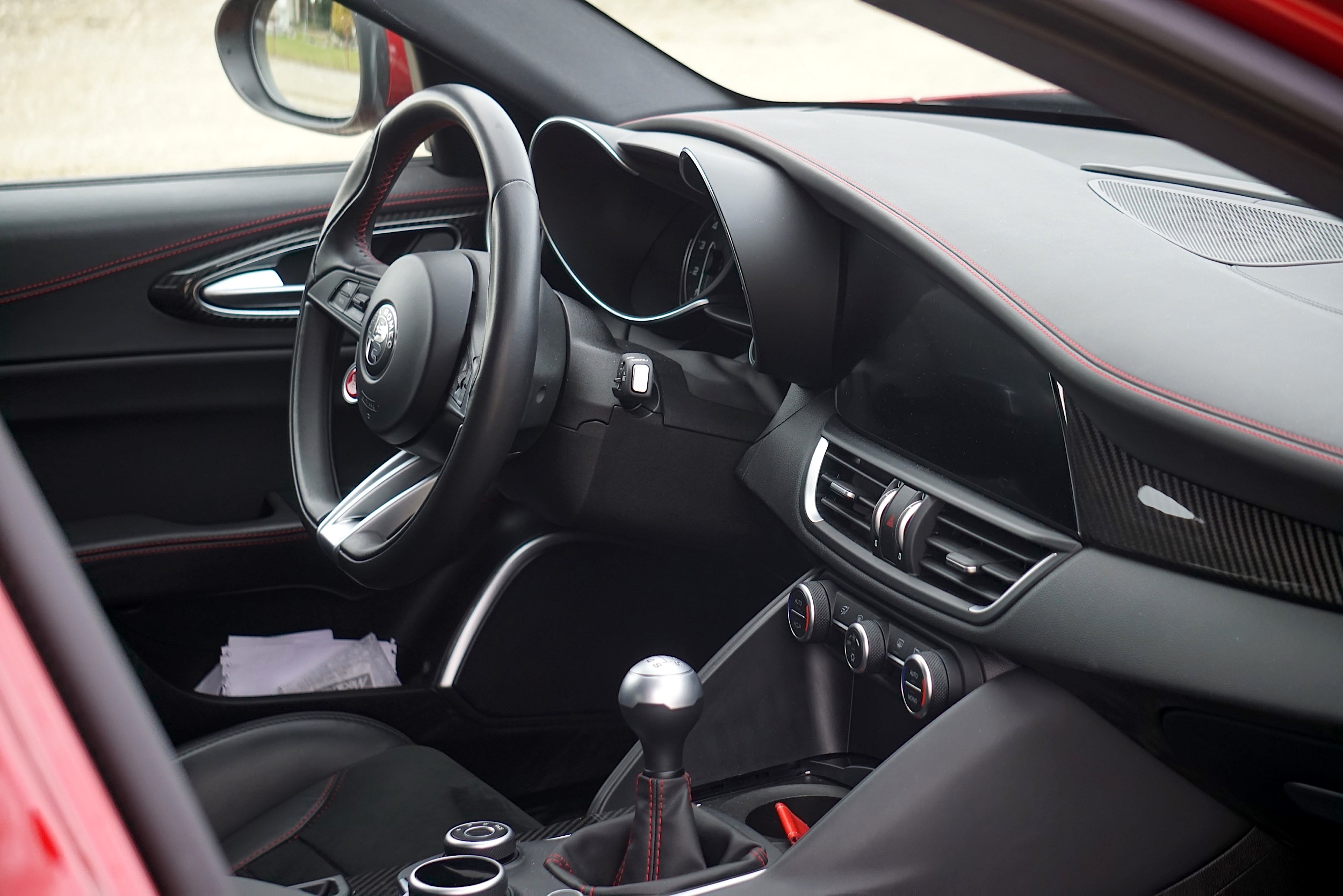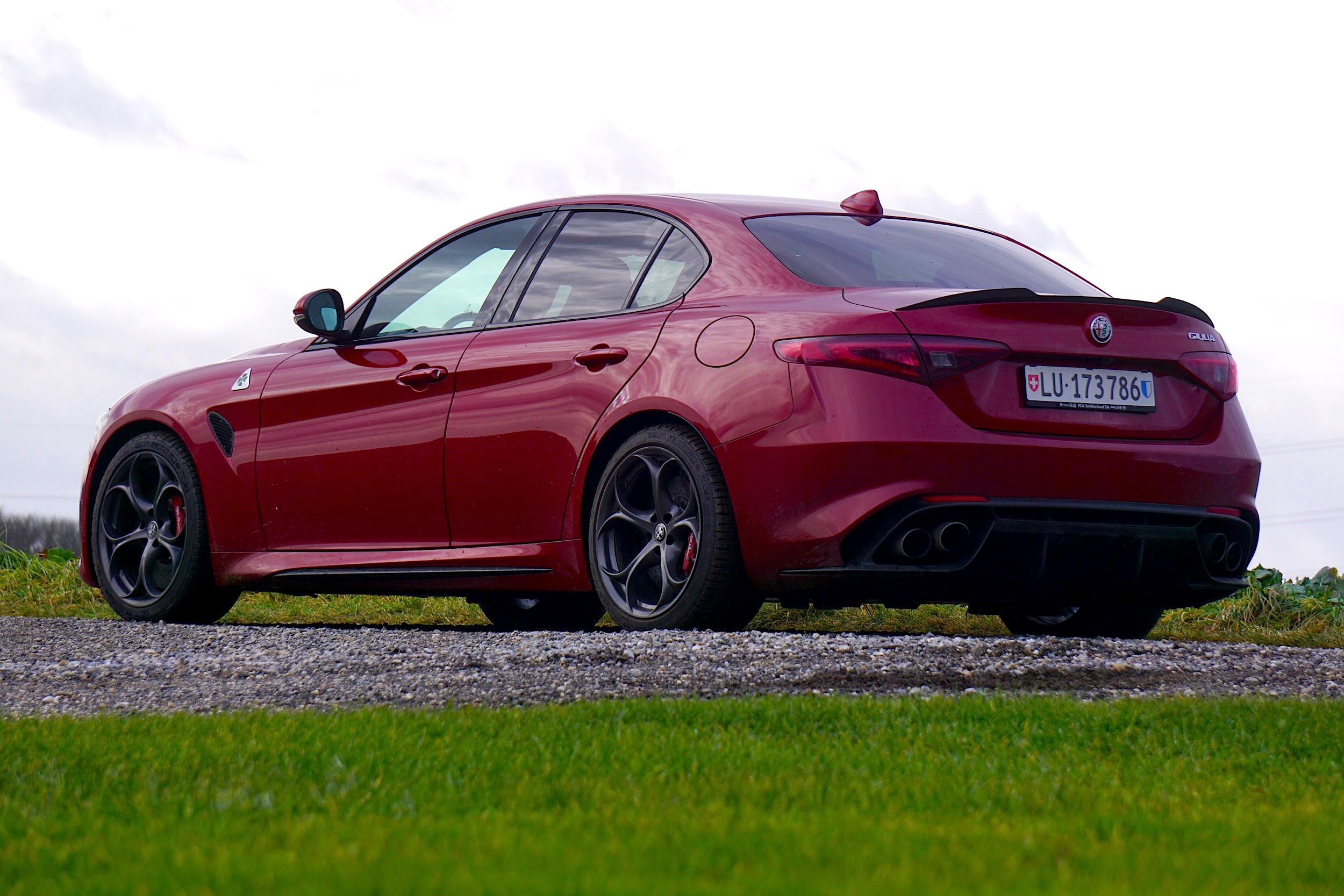 Man sieht sie ja unterdessen auch gut auf der Strasse, die Giulia, sie hat die in der Schweiz kritische Marke von 1000 Fahrzeugen im ersten Verkaufsjahr locker überschritten. Und sie ist ja auch ein erfreulicher Anblick im Umfeld der leasinggrauen deutschen Premium-Konkurrenten, ganz besonders als QV. Gut, das ist gerade hinten schon ziemlich dick aufgetragen, die vier Endrohre, die breiten Backen, aber: so AMG-Zeugs sieht viel prolliger aus, auch M-BMW sind ja nicht gerade zurückhaltend (die Audi sehen wir nicht als Konkurrenz, die sind entweder Fronttriebler oder dann Allradler, das ist eine andere Zielgruppe). Sie tritt ja eigentlich an gegen 3er und C-Klasse, aber im Innenraum ist sie mehr auf der Höhe von 5er und E-Klasse, räumlich gesehen.