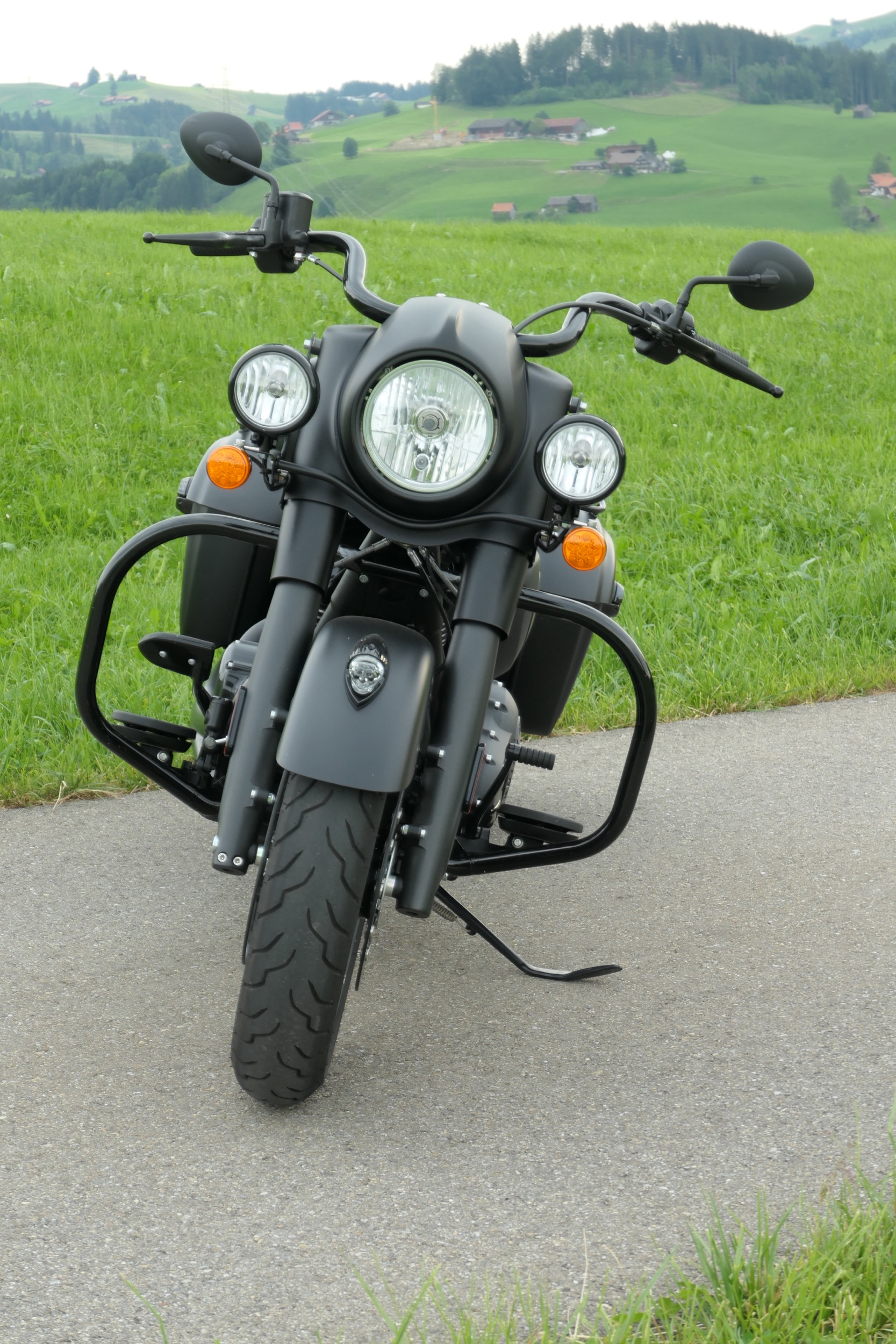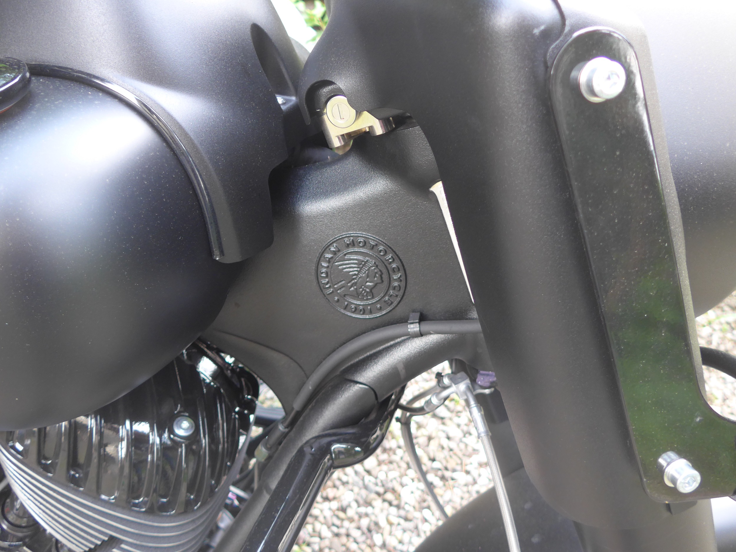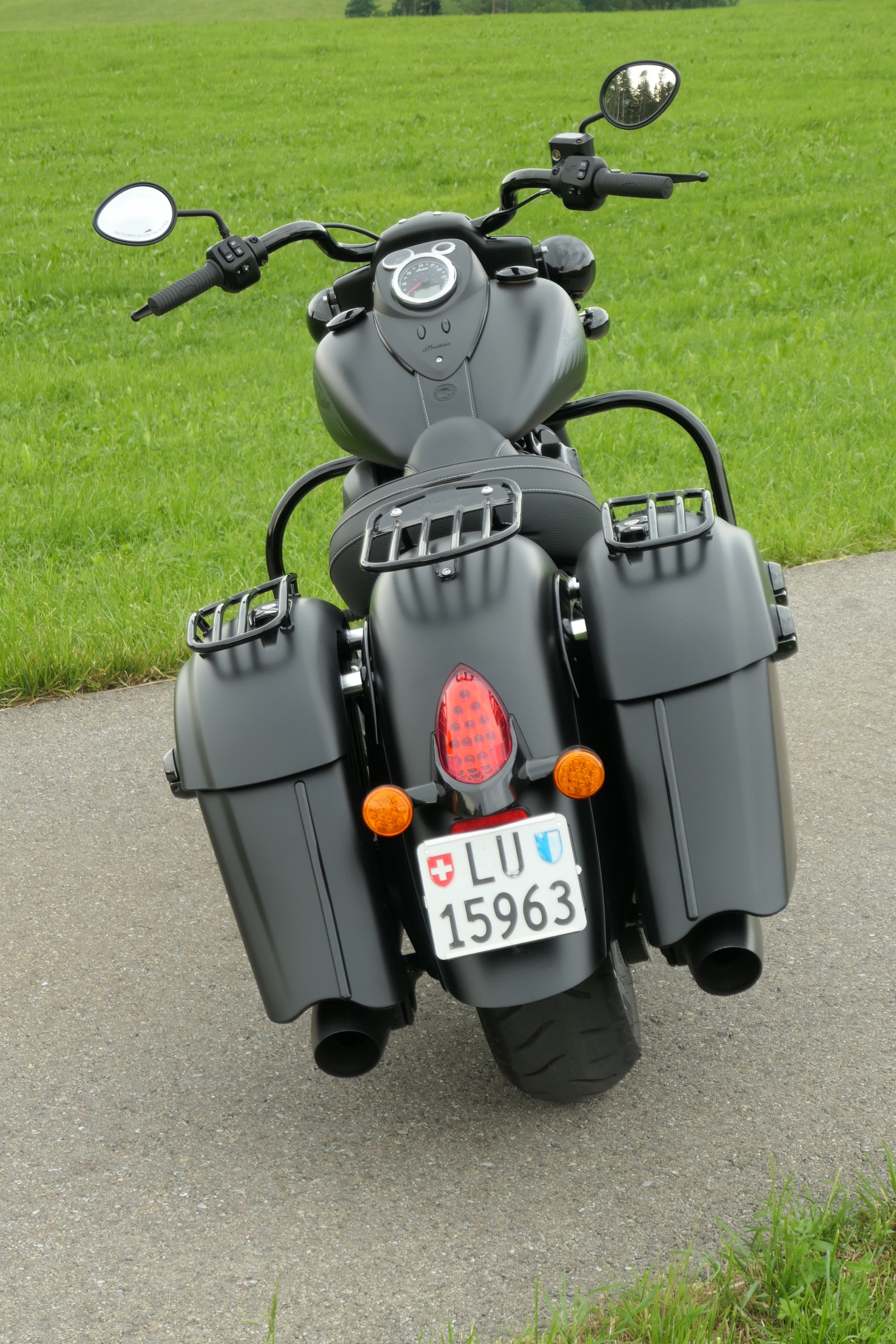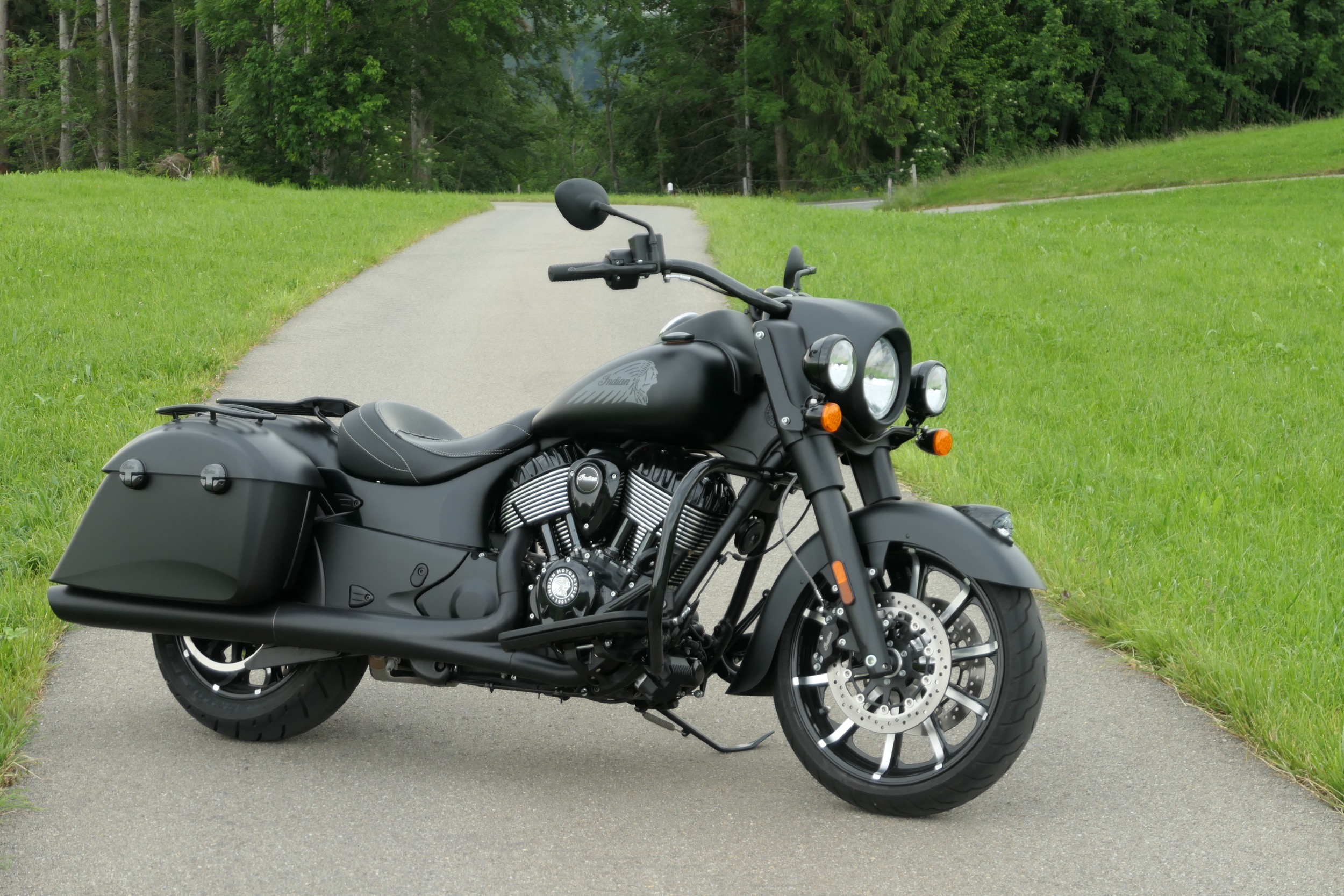 Dieser poltert auch in der gefahrenen Indian Springfield Dark Horse. An diesem schnörkellos geradlinigem Motorrad ist alles mächtig und massiv. Da sucht man vergeblich nach schnödem Plastik. So sind Tank und Schutzbleche aus solidem Metall. Die schieren Abmessungen mit einer Länge von 2583 Millimetern und einer Breite von 990 Millimetern sind beeindruckend. Dazu kommt ein Gewicht von vollgetankt 388 Kilogramm. Und das bei einem Motorrad im typischen Bagger-Style, also ohne feste Frontverkleidung und mit tiefem, fettem Heck inklusive zwei Seitenkoffern. Passend zum Namenszusatz «Dark Horse» ist das ganze Bike in mattes Schwarz getaucht, einzig der Motor glänzt in schwarzem Lack, womit auch das Indianerkopf-Emblem schön zur Geltung kommt. Vorne thront auf dem Schutzblech über dem 19 Zoll-Vorderrad das gläserne Indianerkopf-Positionslicht. Die grosse Historie dieser Traditionsmarke wird auch bei der Springfield Dark Horse gekonnt zur Schau gestellt.