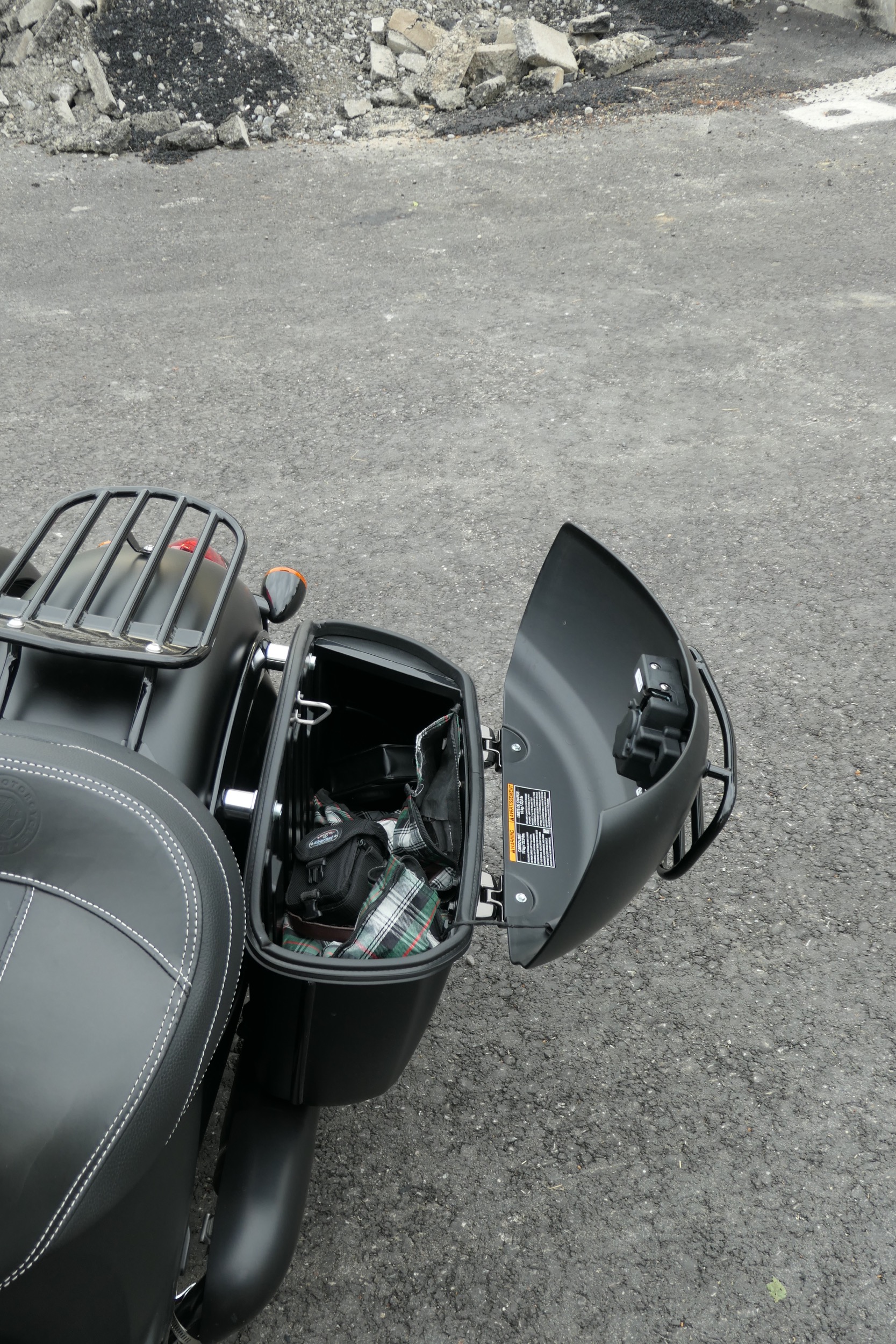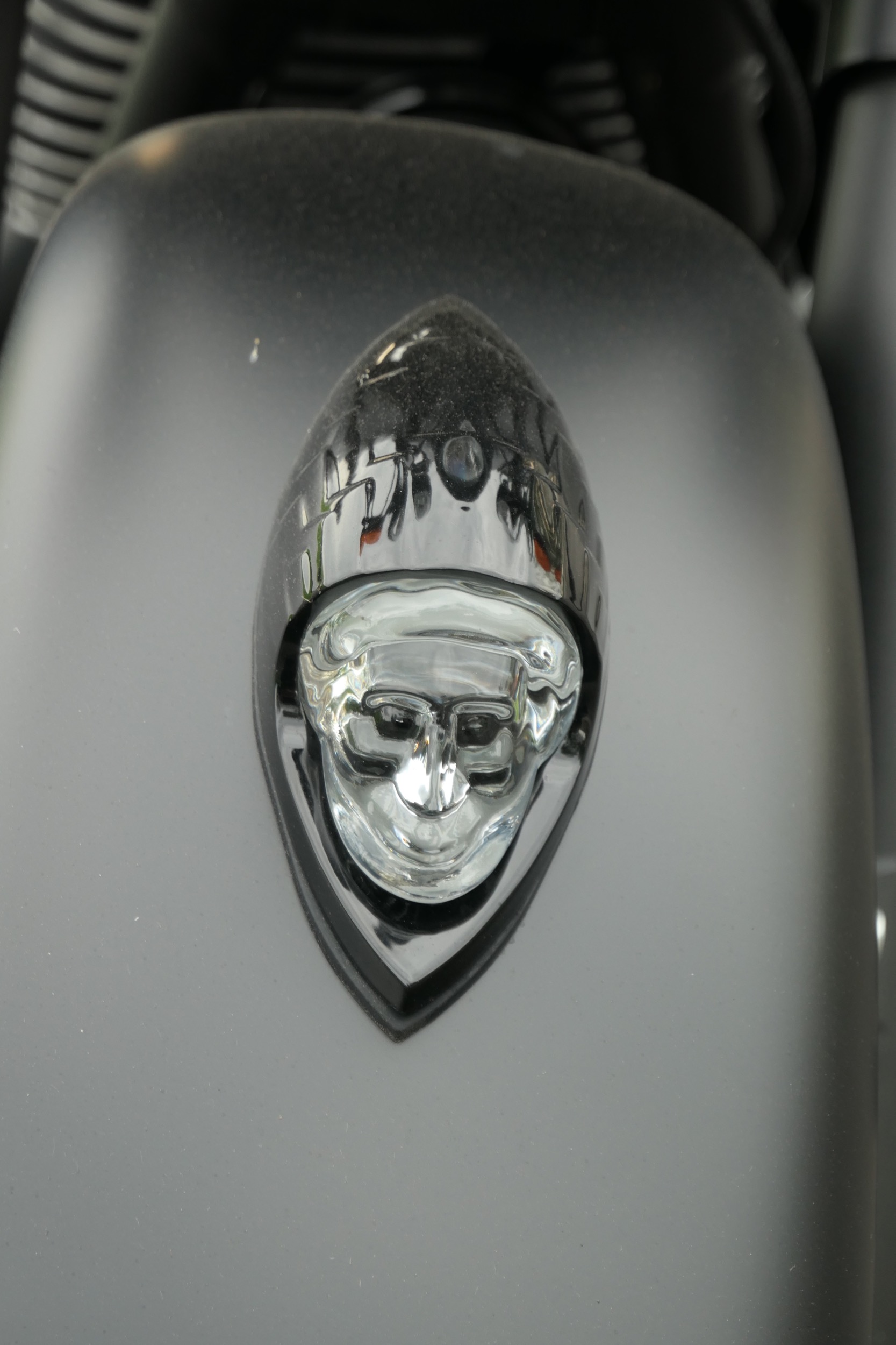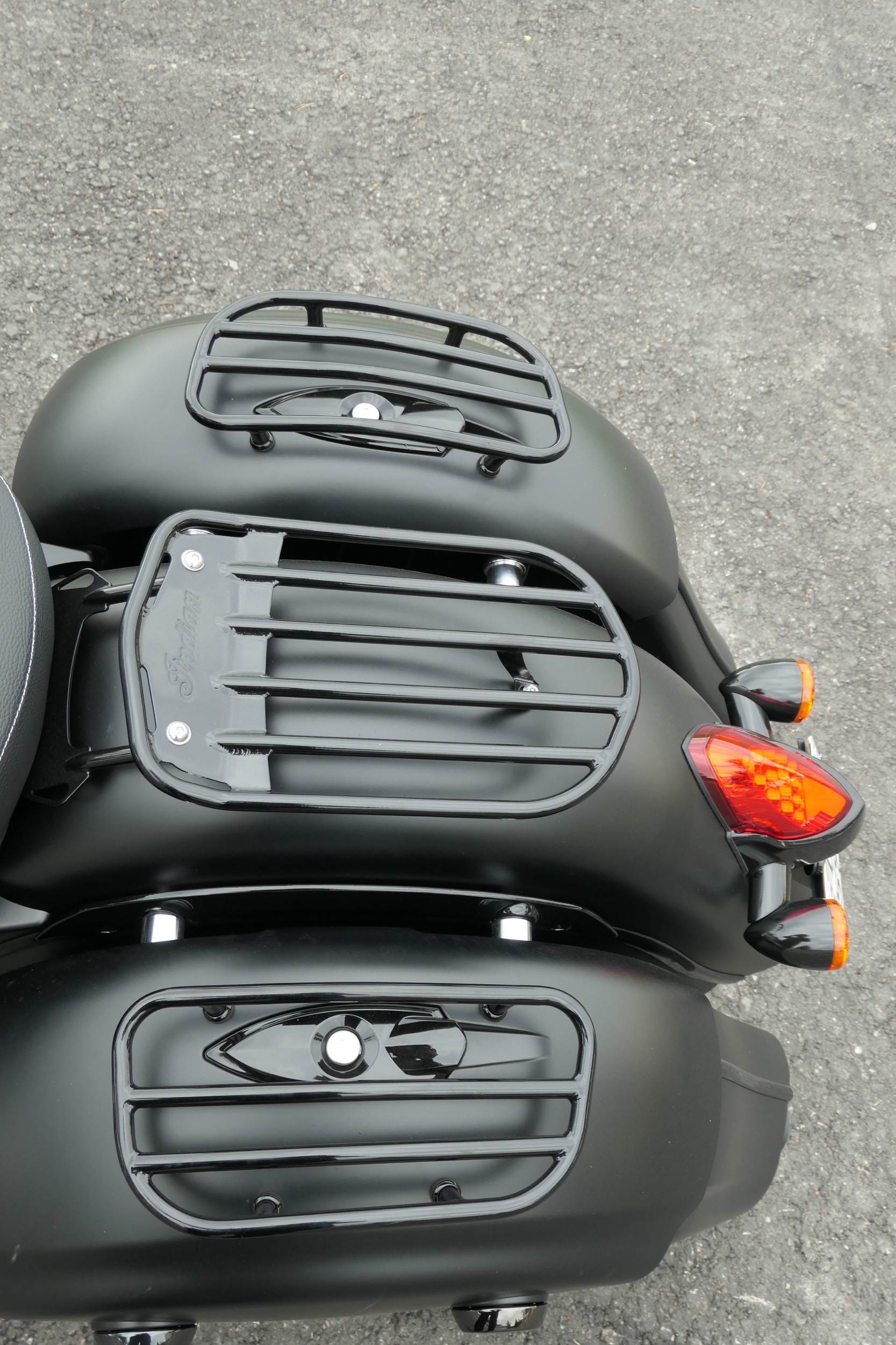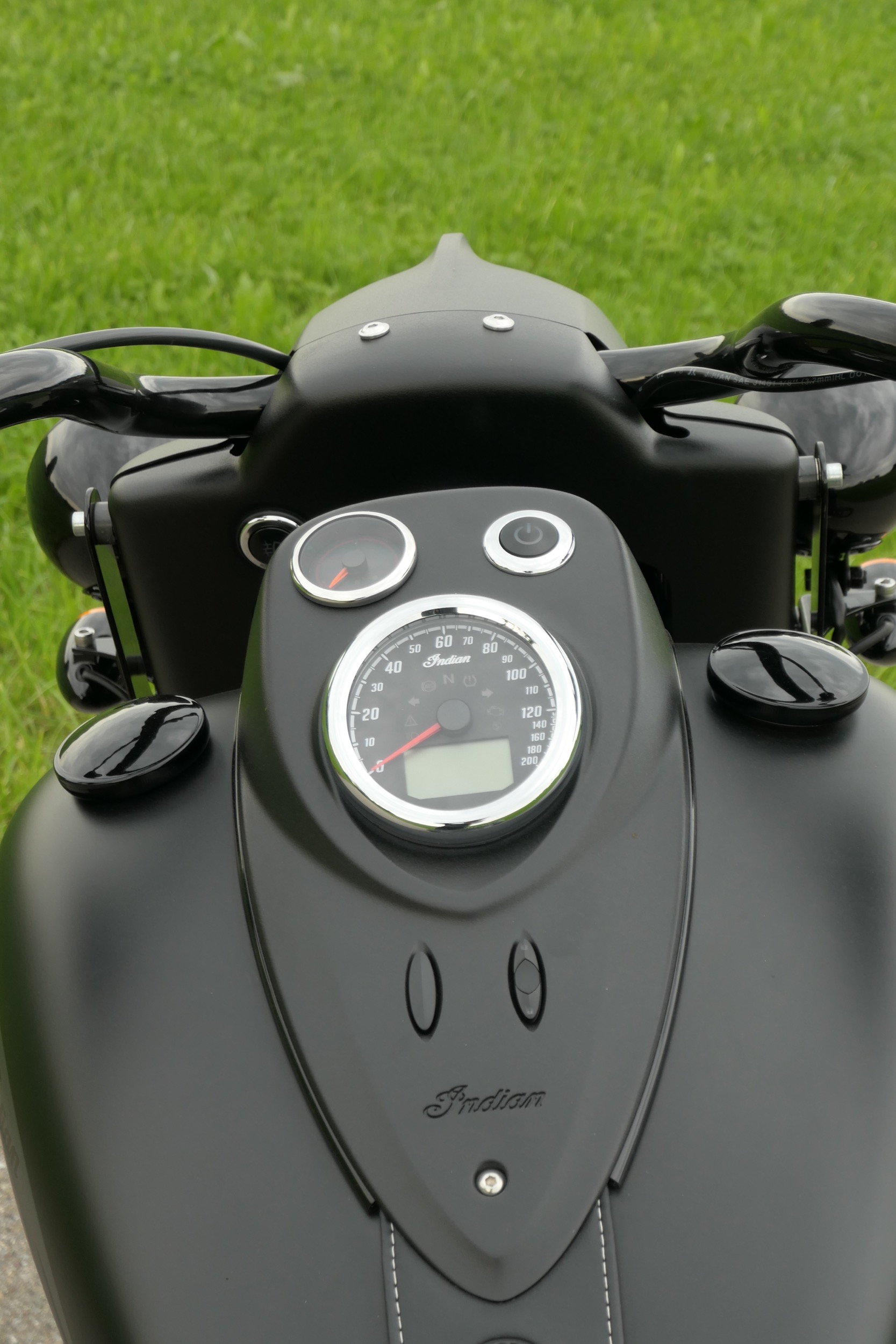 Dieser poltert auch in der gefahrenen Indian Springfield Dark Horse. An diesem schnörkellos geradlinigem Motorrad ist alles mächtig und massiv. Da sucht man vergeblich nach schnödem Plastik. So sind Tank und Schutzbleche aus solidem Metall. Die schieren Abmessungen mit einer Länge von 2583 Millimetern und einer Breite von 990 Millimetern sind beeindruckend. Dazu kommt ein Gewicht von vollgetankt 388 Kilogramm. Und das bei einem Motorrad im typischen Bagger-Style, also ohne feste Frontverkleidung und mit tiefem, fettem Heck inklusive zwei Seitenkoffern. Passend zum Namenszusatz «Dark Horse» ist das ganze Bike in mattes Schwarz getaucht, einzig der Motor glänzt in schwarzem Lack, womit auch das Indianerkopf-Emblem schön zur Geltung kommt. Vorne thront auf dem Schutzblech über dem 19 Zoll-Vorderrad das gläserne Indianerkopf-Positionslicht. Die grosse Historie dieser Traditionsmarke wird auch bei der Springfield Dark Horse gekonnt zur Schau gestellt.