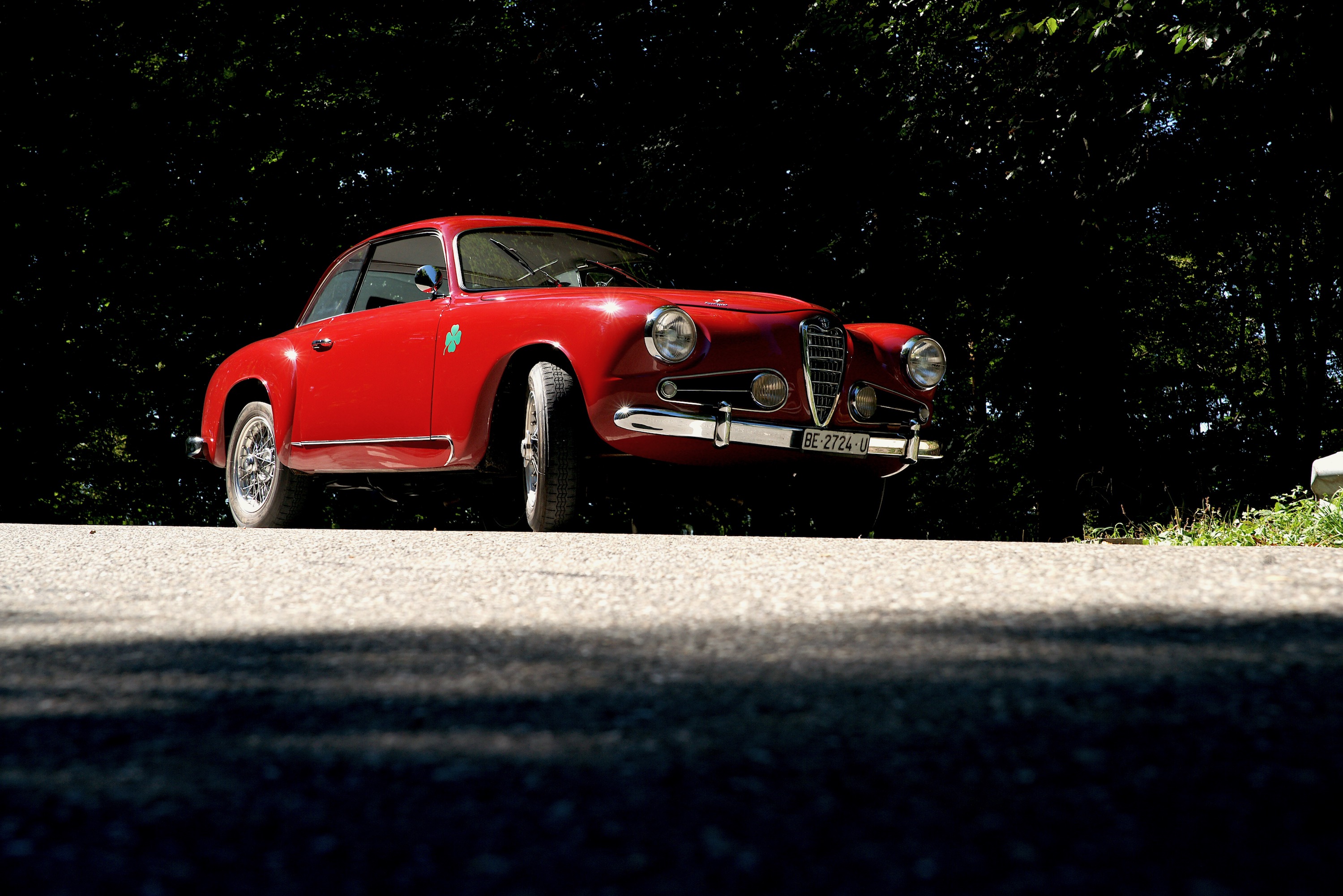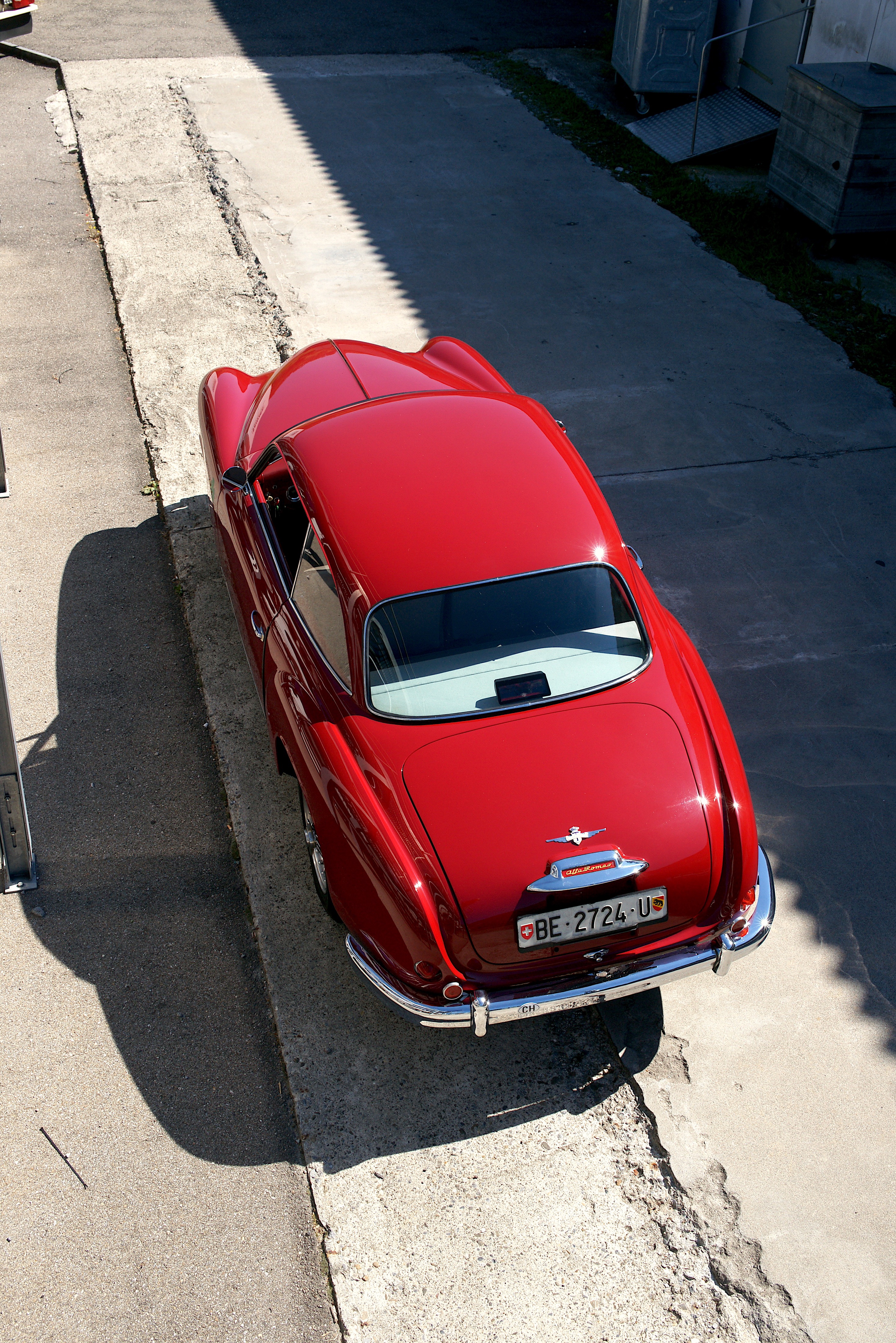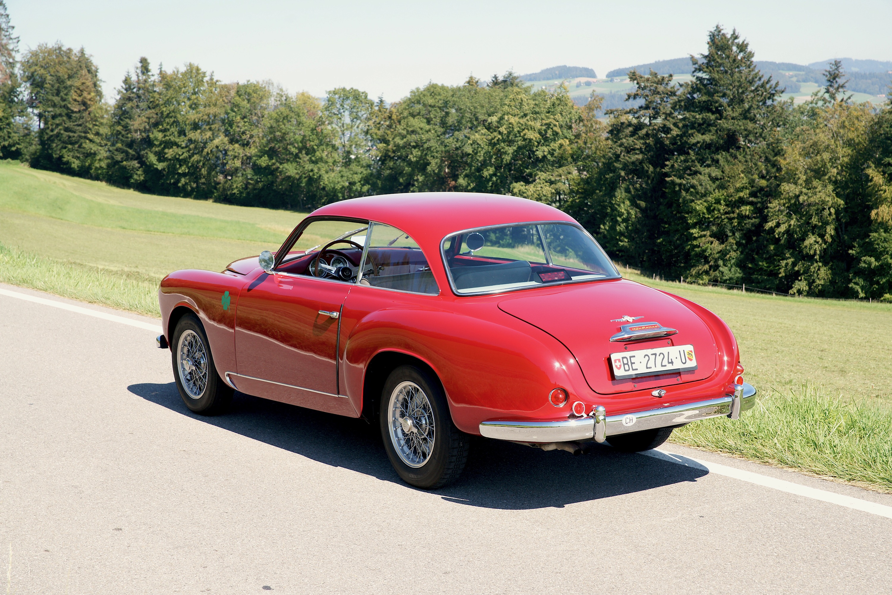 SS steht für Super Sprint, also einen 1900er mit 2-Liter-Motor, 112 PS (obwohl es den offiziell erst ab 1956 gab, unser Fahrzeug aber Jahrgang 1955 hat). Das tönt jetzt nicht nach einer frivolen Party auf der Strasse – und das ist es auch nicht. Zumindest nicht nach heutigen Standards, jeder Kleinwagen wird dem Alfa sein banales Heck zeigen. Und es ist so etwas von egal, denn der Vierzylinder mit seinen zwei obenliegenden Nockenwellen liefert dafür eine schön lineare Kraftentfaltung, singt dazu ein wunderschönes, metallisches Lied, man fühlt sich mittendrin, nicht voll daneben. Gefragt ist vorausschauendes Fahren, man muss die Strasse spüren, wohin führt die Kurve, was verträgt sie, denn man wird nicht von einer Drehmomentwand gerettet, der es völlig egal ist, ob man nun in der Zweiten hochtourig durch die Biegung fräst oder ihn in der Fünften gerade noch so rumwürgt. Bist Du im Alfa im falschen Gang, bist Du langsam; bist Du im richtigen, dann bedenke, dass Du das Lenkrad bitte mit beiden Händen festhalten musst. Man muss also mitdenken – und das ersetzt dann auch gleich alle Assistenzsysteme.
