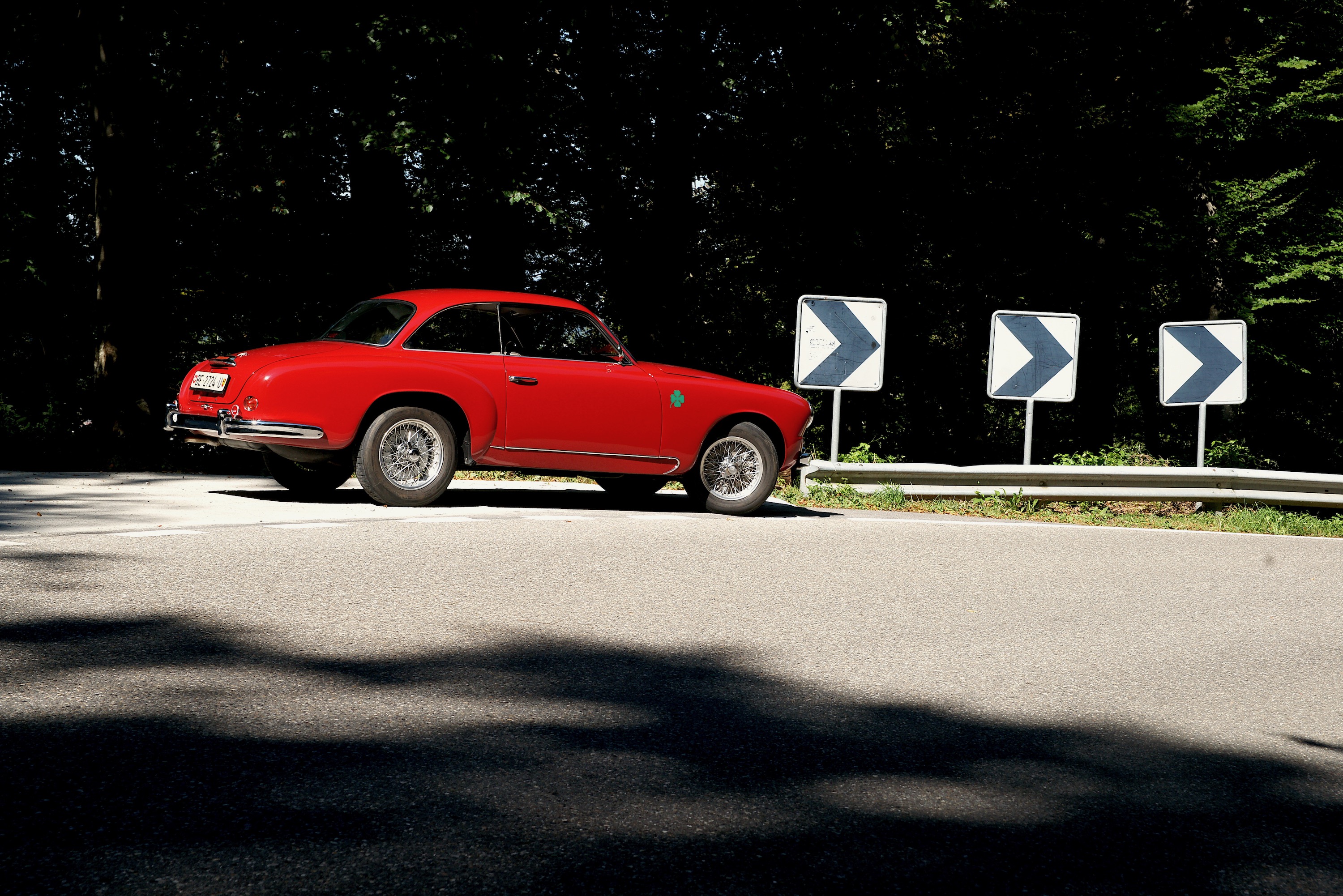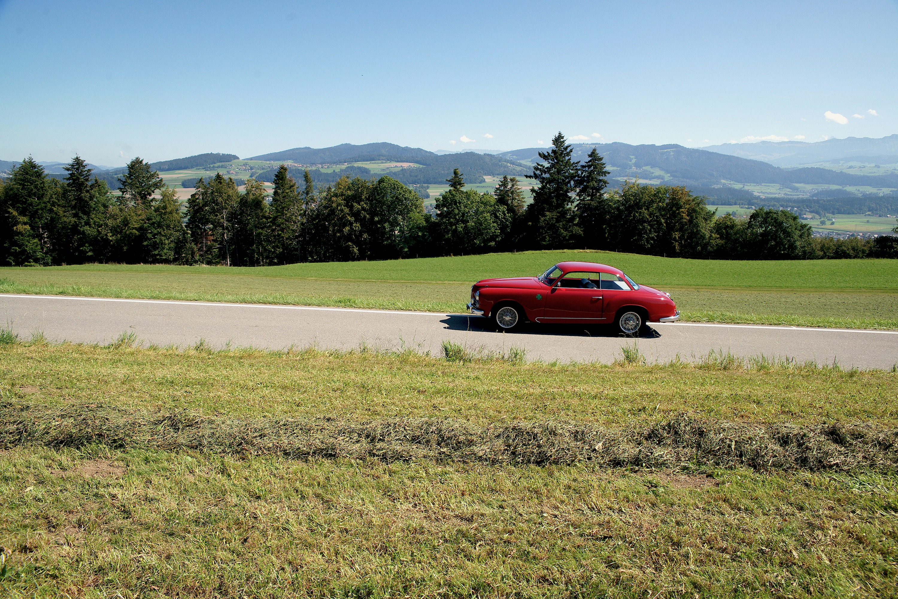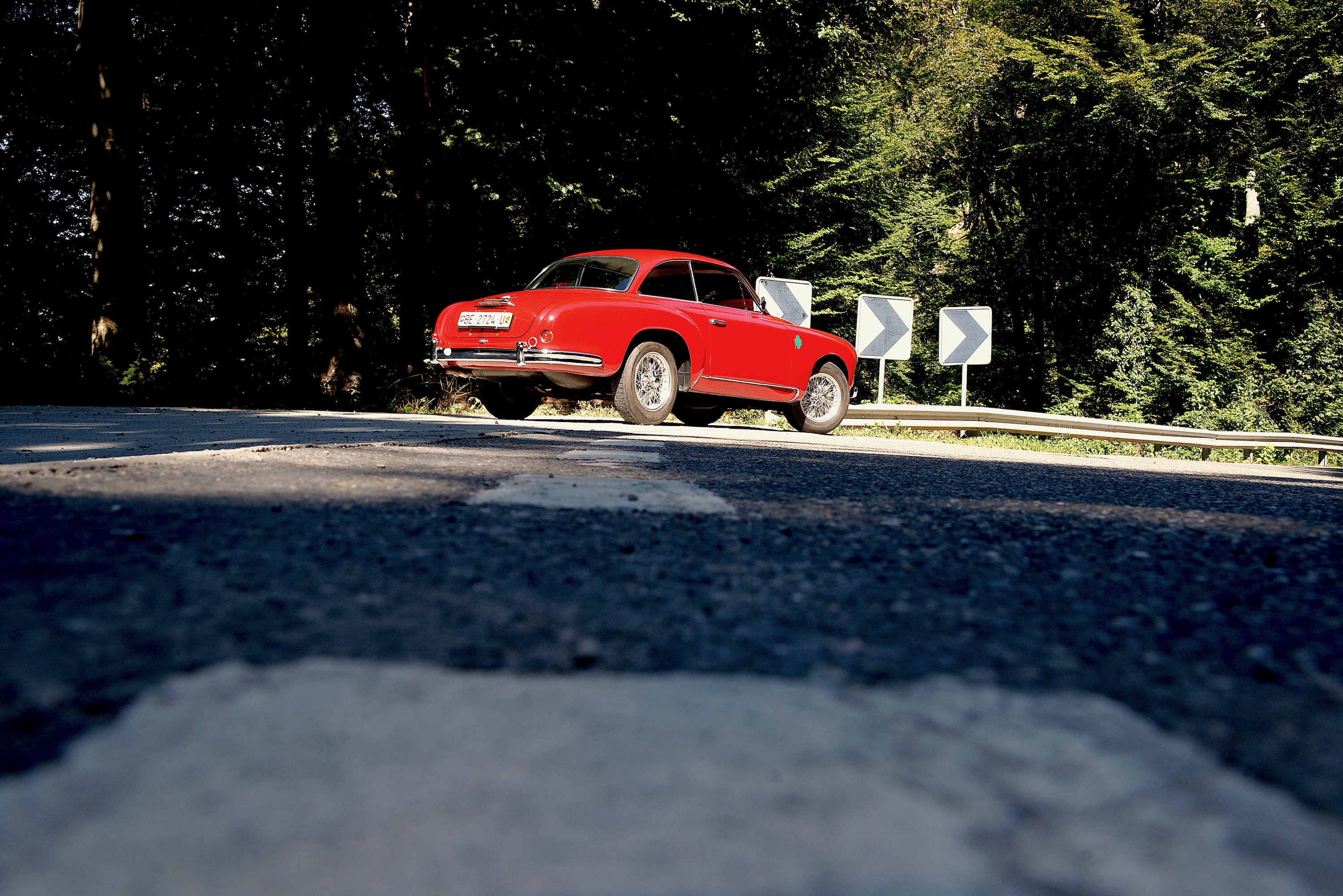 Die Bremse braucht Kraft (sie hat ja auch keinen Servo). Bis Du dann merkst, dass auch Kraft nicht viel bringt, denn es passiert auch mit mehr Kraft nicht wirklich viel. Oder die vorderen Räder blockieren. Was man ja nicht dringend braucht. Und so passt man sein Fahrverhalten dem Fahrverhalten des Alfa an, genügend Abstand, das Auto vor der Kurve stabilisieren, ruhig halten (man braucht ja dann eh reichlich Kraft in den Armen), die Kurve schön gezielt und mit Hochachtung vor dem Strassenbauer umrunden; man kann auch schon vor dem Scheitelpunkt wieder beschleunigen, 112 PS, das ist, wie geschrieben, nicht besonders wild. Zwar verfügte der 1900er als eines der ersten Nachkriegsfahrzeuge vorne über Stabis, doch die Seitenneigung ist bedenklich; hinten gibt es eine Starrachse, bitte nicht vergessen. Es ist also alles etwas gemächlicher, und doch viel Arbeit, es bleibt alles in einem Geschwindigkeitsrahmen, der kaum beunruhigend ist und auch die Rennleitung erfreut. Um ehrlich zu sein: eine Langstrecken-Rallye über drei Tage und 2000 Kilometer möchten wir im Hochsommer nicht dringend fahren mit diesem Alfa Romeo – er gibt zwar viel, aber er fordert noch mehr.