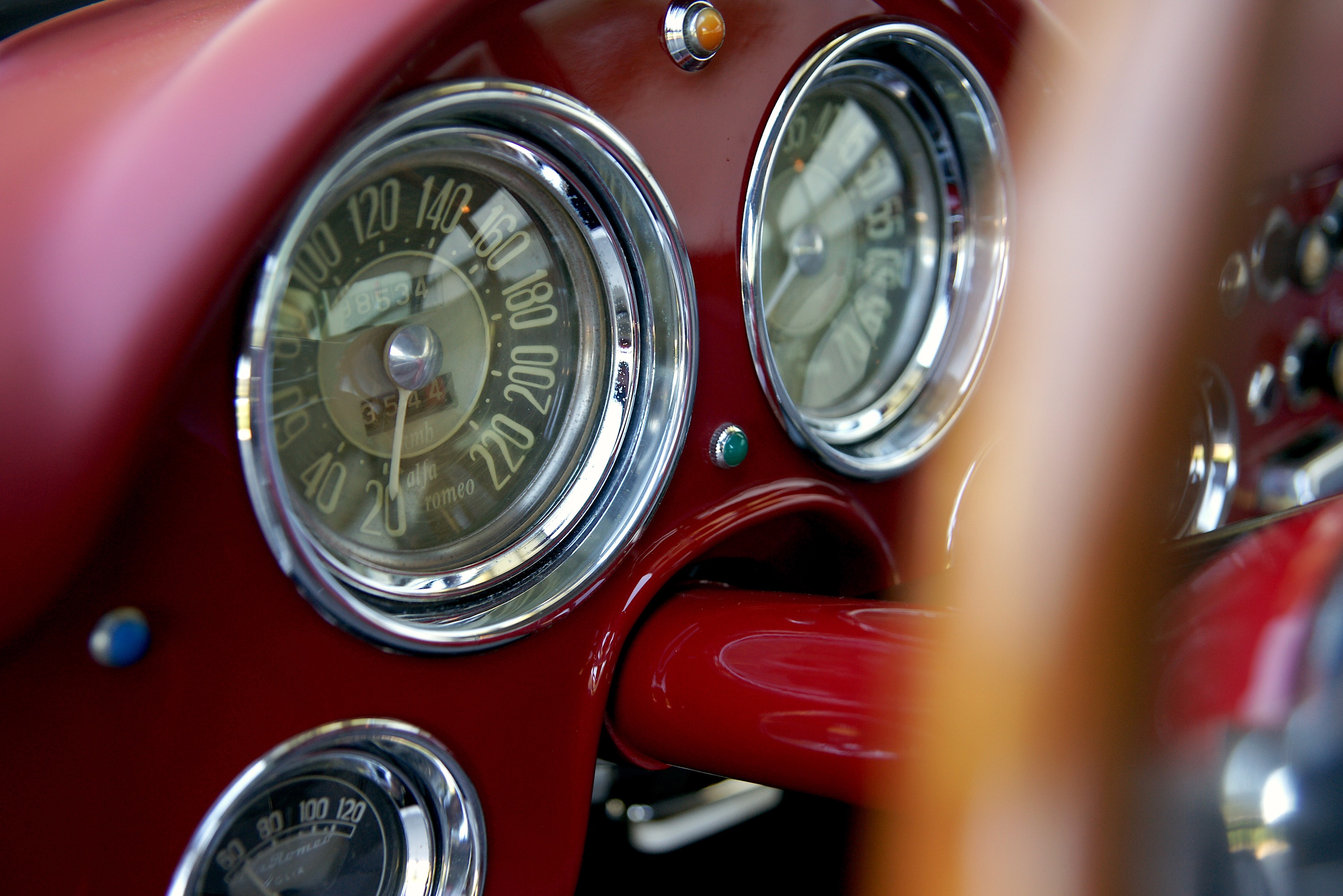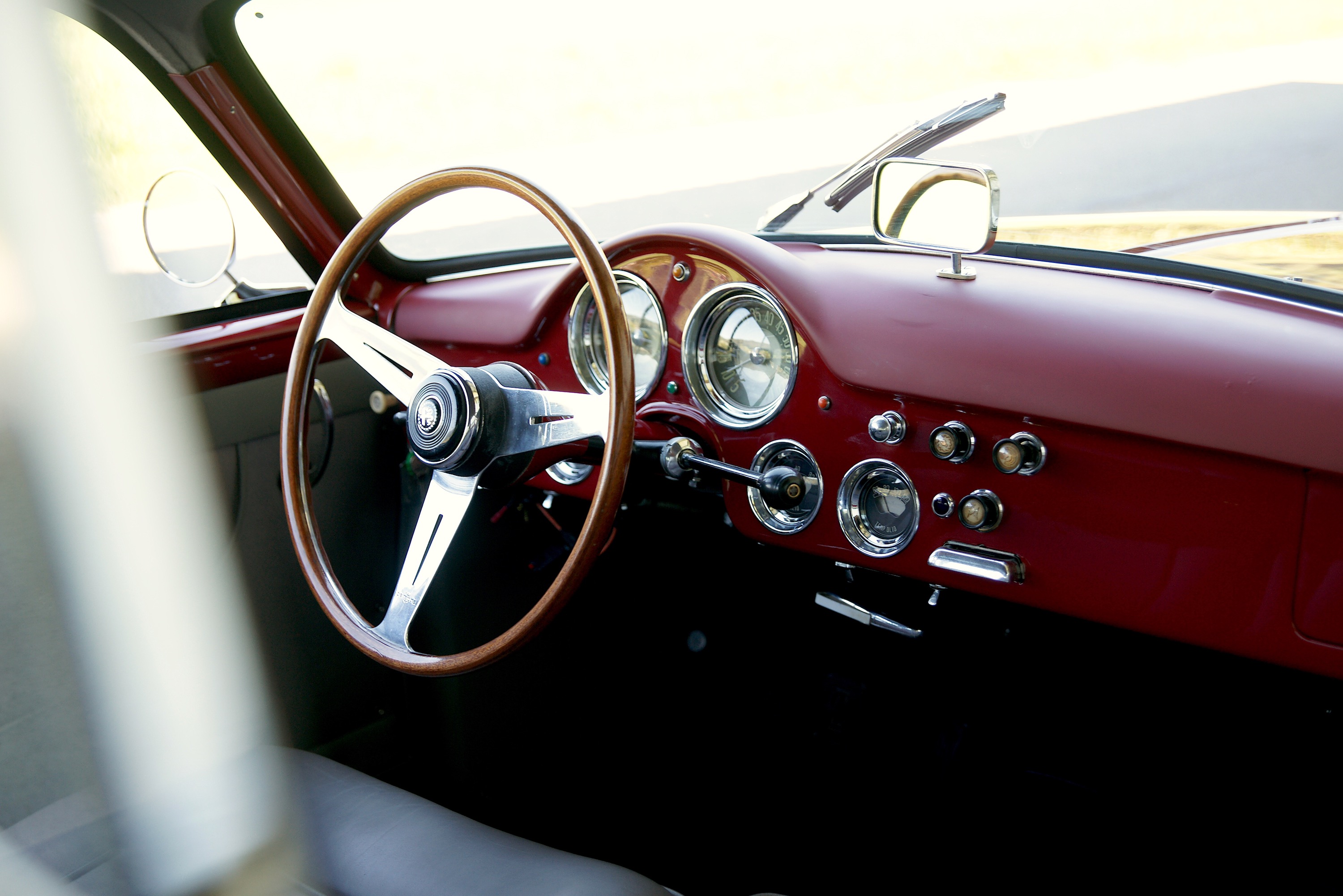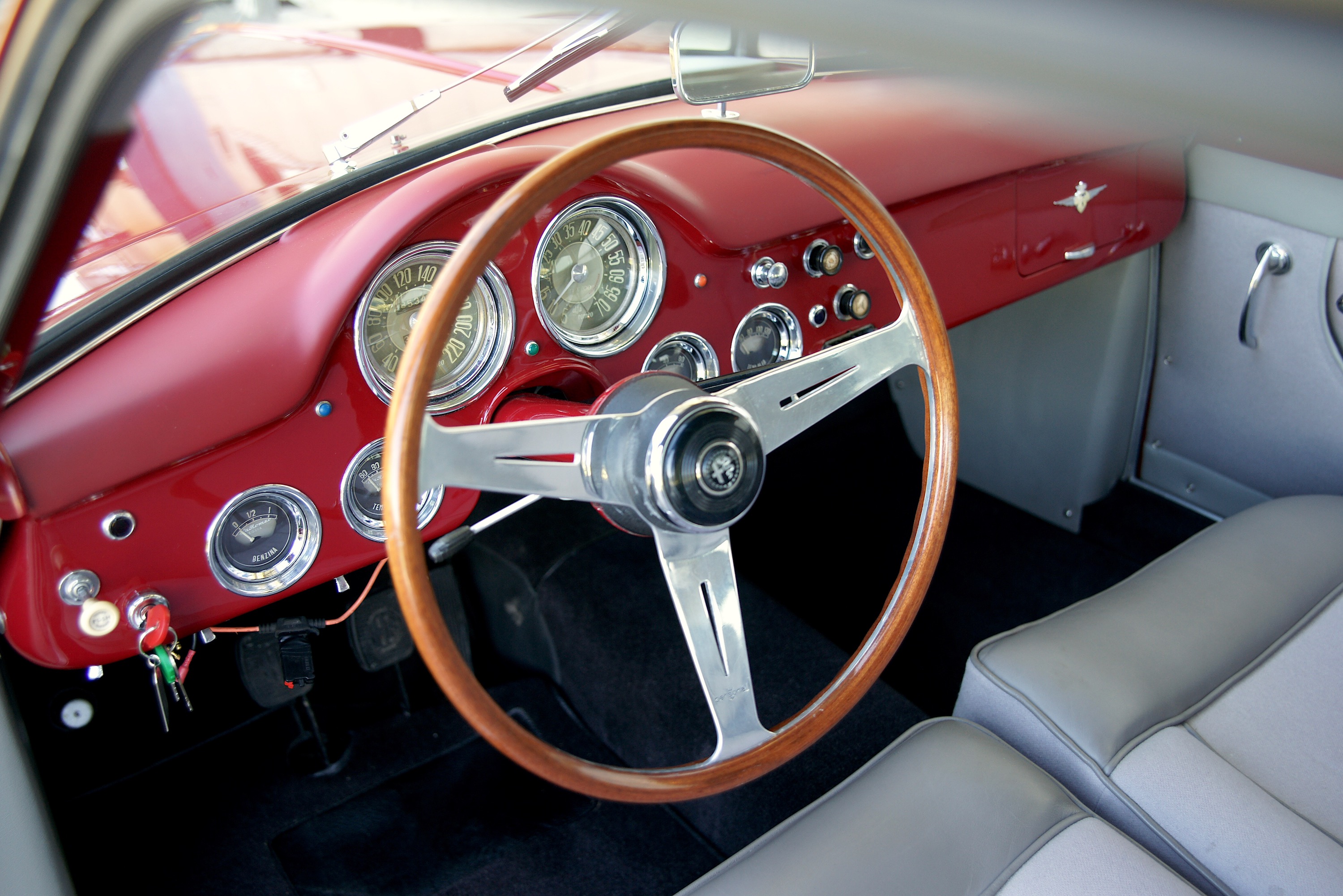 Es ist halt so: Wenn man den Alfa betrachtet, kommt man beim besten Willen nicht auf die Idee, dass er schon 65 Jahre alt ist. Natürlich ist er zeitlos schön, die besten Jahre von Touring, aber man vergisst dabei gern, dass es halt damals noch keine Servounterstützung gab. Und eben, solche Dinge wie Lenkradschaltung mit gut versteckten Rückwärtsgängen. Es ist auch sonst fast alles anders, die Sitze sind keine Schraubstöcke, sondern so schön, dass man sie sich ins Wohnzimmer stellen möchte. Und das Cockpit mit seinen herrlichen, analogen Armaturen ist weder ergonomisch noch wirklich bedienerfreundlich, weil man sich vor 65 Jahren noch nicht um solchen Kram gekümmert hat, sondern in erster Linie das Auge des Betrachters erfreuen wollte. Allein schon die Zahlen auf dem Tacho wurden mit viel mehr Liebe gestaltet als die heutigen, chinesischen Billig-Bildschirme Pixel-Auflösung haben. Rückfahr-Kamera? Braucht man ja nicht, wenn man nicht einmal weiss, wo der Rückwärtsgang ist. Und sonst kann man ja fragen, das fördert auch die sozialen Kontakte. Navi? Mit diesem Alfa kannst Du wohinauchimmer fahren, Du bist ja sowieso längst angekommen – im wahren Leben. Und überhaupt ist mit einem solchen Fahrzeug der Umweg das Ziel.