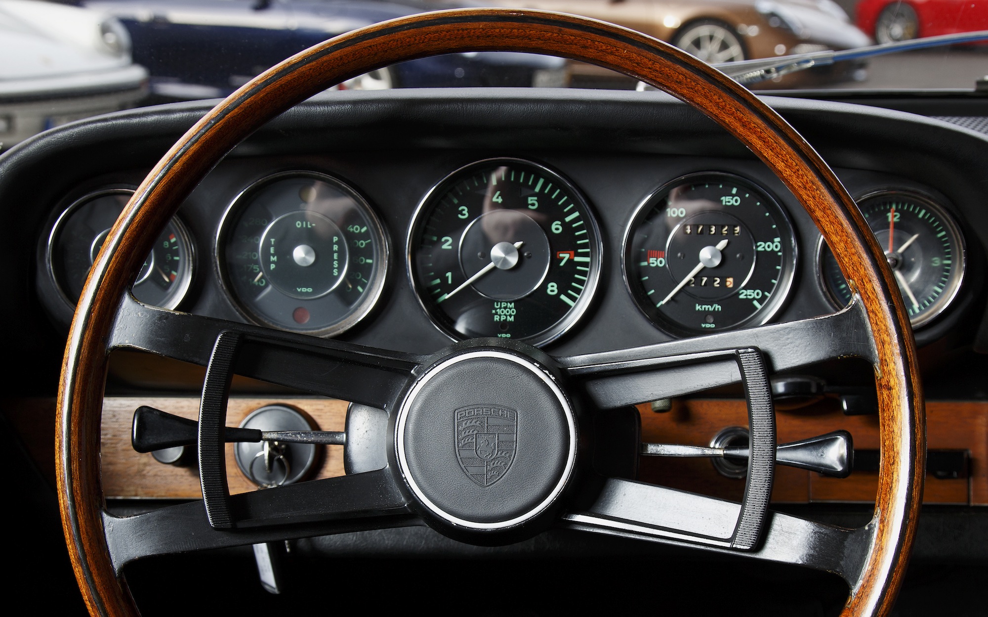 Doch verlassen wir die «Aussenansicht» und setzen uns hinters Lenkrad des 64ers. Wie damals üblich sitzt man hinter einem spindeldürren Teil, davor befindet sich eine Uhrensammlung (Porsche-typisch mit fünf Rundinstrumenten) mit allen wichtigen Angaben. Dazu ein paar Kontroll-Leuchten und Wippschalter. Und: die Ergonomie ist nicht mal so schlecht. Klar, heute hat jeder Fiat Panda ergonomisch bessere Sitze. Aber die Stühle im Elfer sind nicht unbequem. Der Schalthebel ist für grosse Zeitgenossen vielleicht ein bisschen weit vorne angebracht. Schalten muss man allerdings weit weniger als gedacht (doch dazu kommen wir später). Damals brauchte es nicht mehr und wer in sich geht, muss zugeben, eigentlich würde es auch heute nicht mehr brauchen. Denn durch die eher spartanische Ausrüstung, die wirklich kompakten Abmessungen und den Verzicht auf jeglichen Pomp (heute hat ein Gelände-Fahrrad die breiteren Pneus) ist der Wagen sehr, sehr leicht. Das merkt man im Stand zwar nicht – aber das kann man ja ändern…