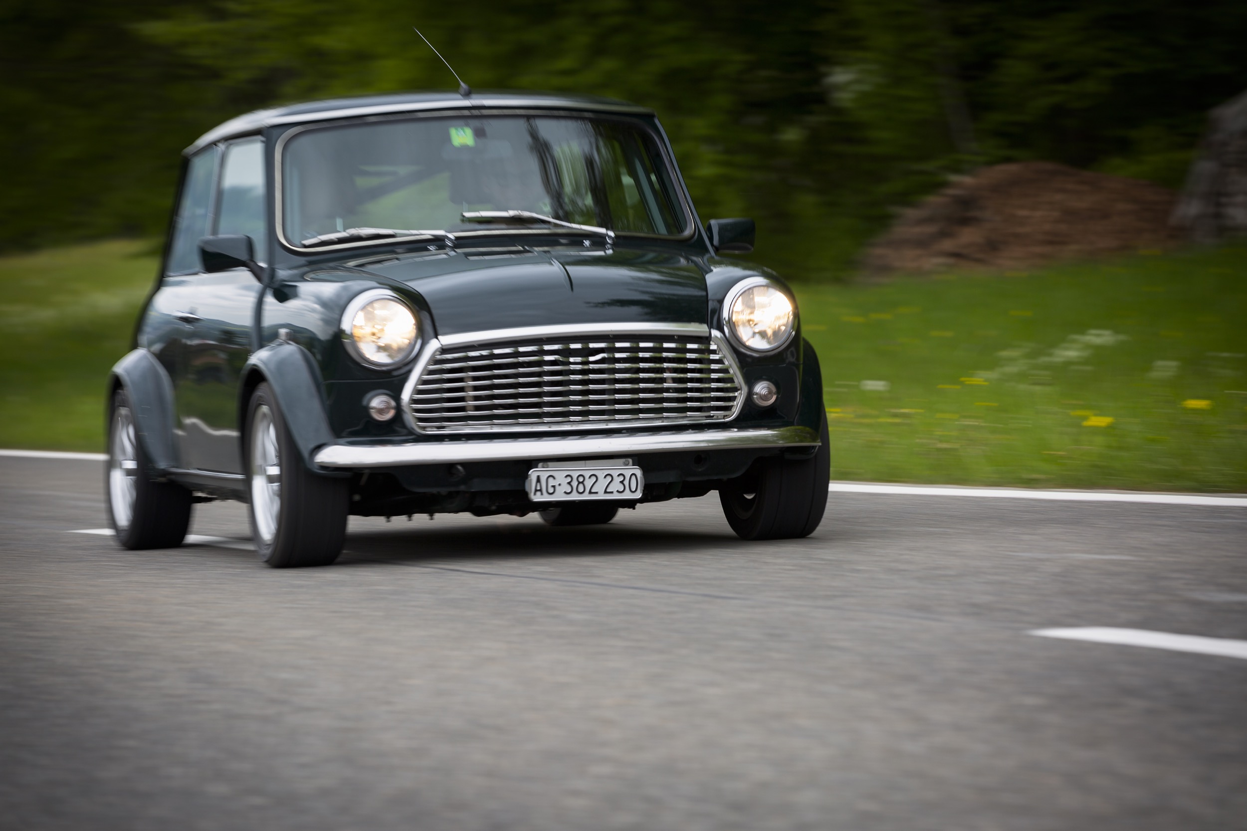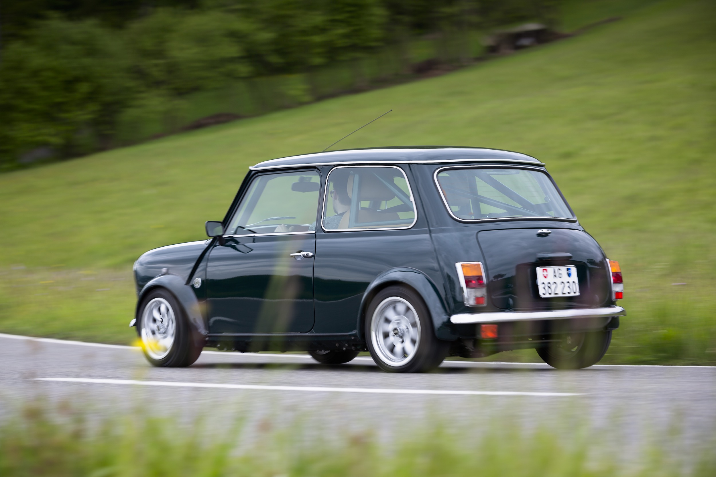 Unschuldig steht er nun da, der Ur-Mini. Als könne er kein Wässerchen trüben. Doch der Schein trügt, denn in dem Kleinen pocht ja ein grosses Herz in Form eines durchzugsstarken Mittelmotors. Der Zweiliter-Turbo wuchtet saubere 220 PS auf die Hinterachse. Damit bringt der Zwerg den Paradesprint in unter vier Sekunden hinter sich, und die Tachonadel bleibt dann bei 200 km/h stehen (elektronisch abgeregelt). Damit lassen sich ausgewachsene Sportwagen jagen. Das ist ganz schön fies, weswegen sein Name nicht von ungefähr kommt: Meanie (von engl. mean = fies).