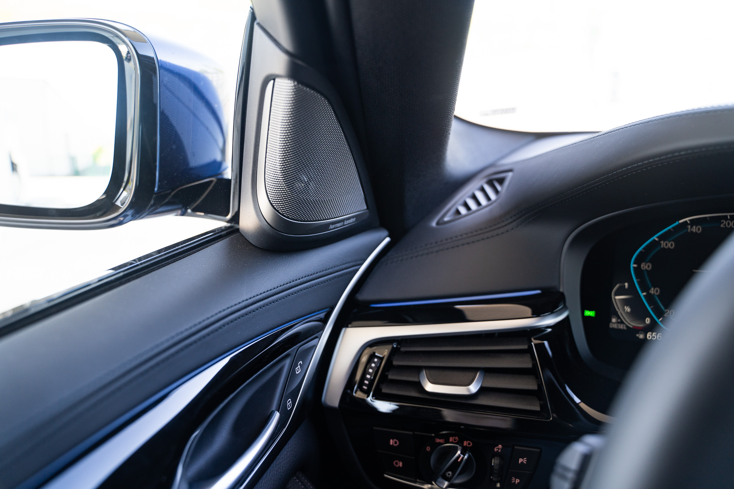 Auch innen ist alles sehr in Ordnung, zumal auf den optionalen Komfortsitzen. Es gibt dazu perfekte Ergonomie, Live Cockpit und die neueste iDrive-Generation. Überraschend: in der Mittelkonsole finden sich zwei Reihen mit konventionellen Drucktasten. Gefühlt scheinen sich diese seit dem E39 nicht mehr geändert zu haben. Und das ist eigentlich gar nicht schlecht.