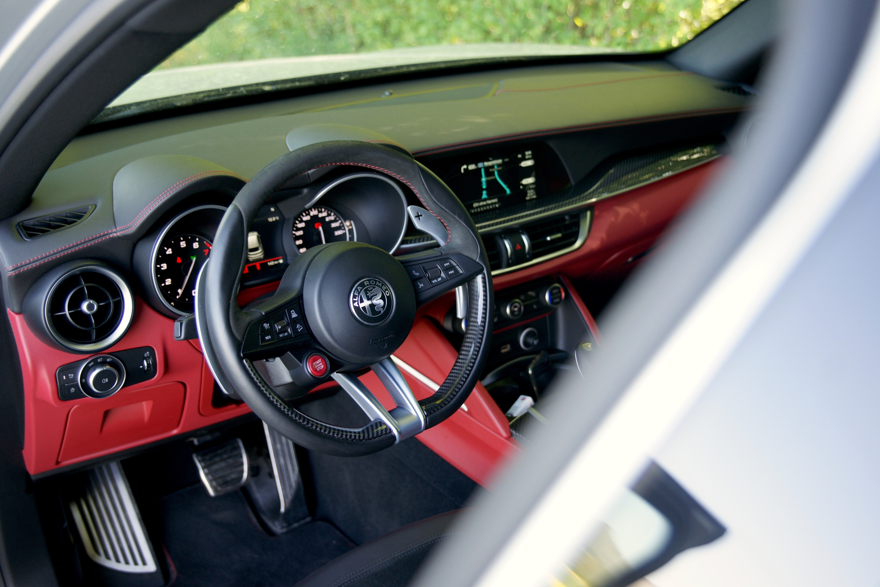 Nicht, dass wir uns falsch verstehen: der Stelvio war sicher nicht das schnellste Gerät am Berg (das ist der Megane, mit Abstand) und auch nicht die präziseste Waffe (Alpine) und nicht die stärkste (Audi), sondern einfach: sehr fröhlich. Diese Mischung aus mehr als genug Power, viel Lärm, sehr gutem Fahrwerk, wunderbarer, präziser Lenkung, viel und schönem Lärm (ok, hatten wir schon, ist aber halt wichtig, wenn es um Fahrspass geht), die ist wirklich erstaunlich erfreulich. Am meisten gestaunt haben wir einmal mehr über Abstimmung des Fahrwerks, das zwar einigermassen weich ist und deshalb gut mit den schlechten Bergstrassen zurechtkommt, aber doch kaum Seitenneigung und Wankbewegungen zulässt; dank Allradantrieb ist da auch richtig, richtig viel Grip. Die Bremsen sind ausgezeichnet, sehr gut dosierbar und standfest, auf den unebenen Gassen mit den vielen Schlägen und in den ganz engen Serpentinen weiss man dann auch wieder, weshalb grosse, feststehende Schalt-Paddles das sind, was man braucht. Ja, das ist ein Kritikpunkt, wenn man denn so will: man schaltet sicher besser selber, ausser im «R»-Modus (da geht es nicht anders…), sonst haut die ansonsten tadellose 8-Gang-Automatik des Alfa etwas gar früh die nächst höhere Welle rein. «R» sei da am Berg aber nur jenen empfohlen, die das Ding im Griff haben – er kommt dann hinten schon ziemlich heftig, wenn man die 510 PS am Kurvenausgang zu früh lanciert; wer eine saubere Linie fährt, den belohnt der ¾-Ferrari-Motor mit wunderbar linearer Kraftentfaltung (maximales Drehmoment von 600 Nm schon bei 2500/min) und grossartigem Sound (ja, ich weiss…). Ach ja, wer es braucht: wenn man den Sechszylinder in den Begrenzer dreht, dann macht er einen heftigen Knall. Kann man durchaus einmal ausprobieren – oder auch öfter…